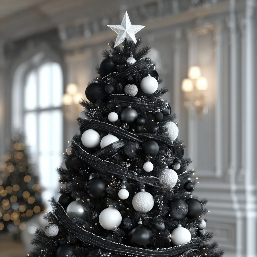 * **Ornaments:** Mix matte black baubles with shiny white ceramic ones. Add pops of metallic silver or subtle grey wood accents.