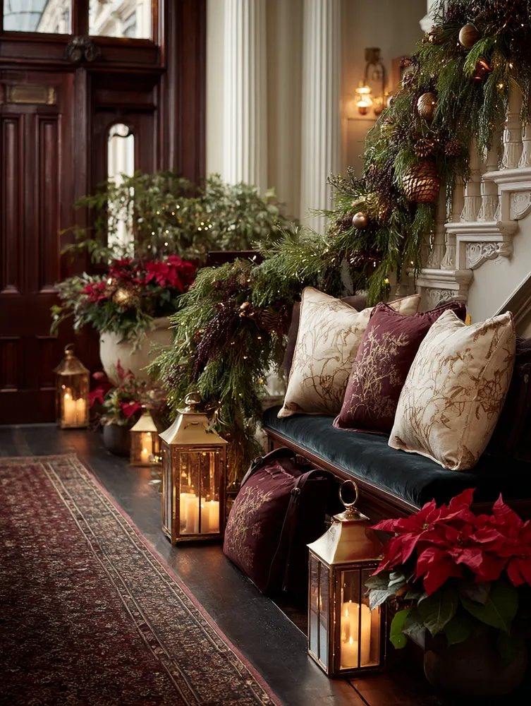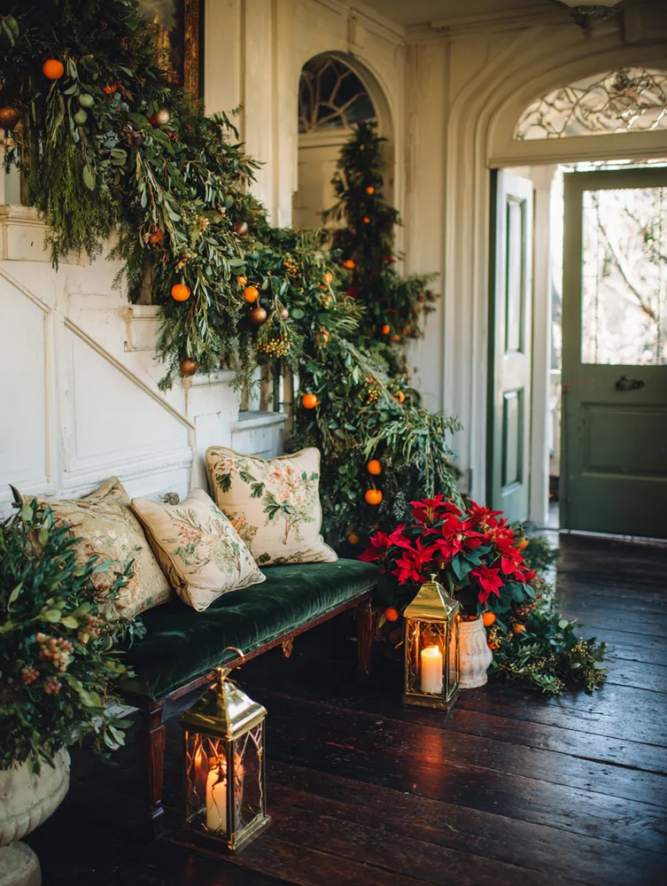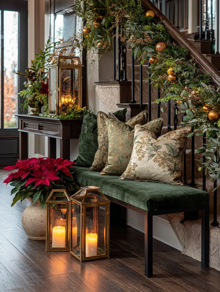 Welcome guests with an unforgettable first impression this Christmas! My entryway is getting a touch of brass and blooms to set a glamorous, festive tone. Forget the typical red and green; we're embracing rich textures and metallic gleam. Here's how to create a stunning Christmas entryway: * **Floral Garland with Brass Accents:** Drape a lush garland of mixed greenery, punctuated with small brass bells and dried orange slices. * **Brass Lanterns with Flickering Faux Flames:** Line the entryway with these for an inviting glow. * **Velvet Bench with Botanical Print Cushions:** A touch of luxurious texture and pattern. * **A Grand Urn Filled with Magnolia & Poinsettias:** Adorned with subtle brass ribbons. * **Subtle Brass Figurines:** Perhaps a deer or dove, placed on a side console. This approach creates a warm, inviting, and undeniably chic entrance. Save for your holiday entryway inspo! ๐ฅ