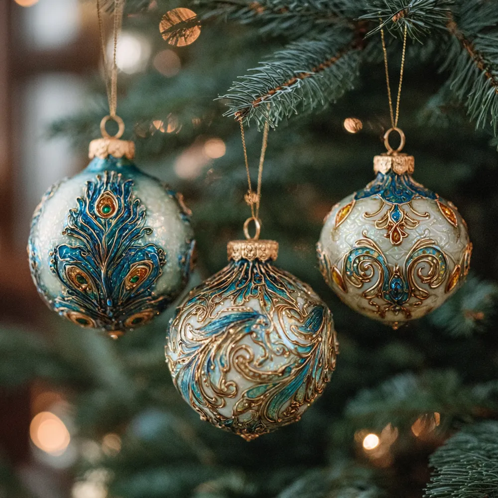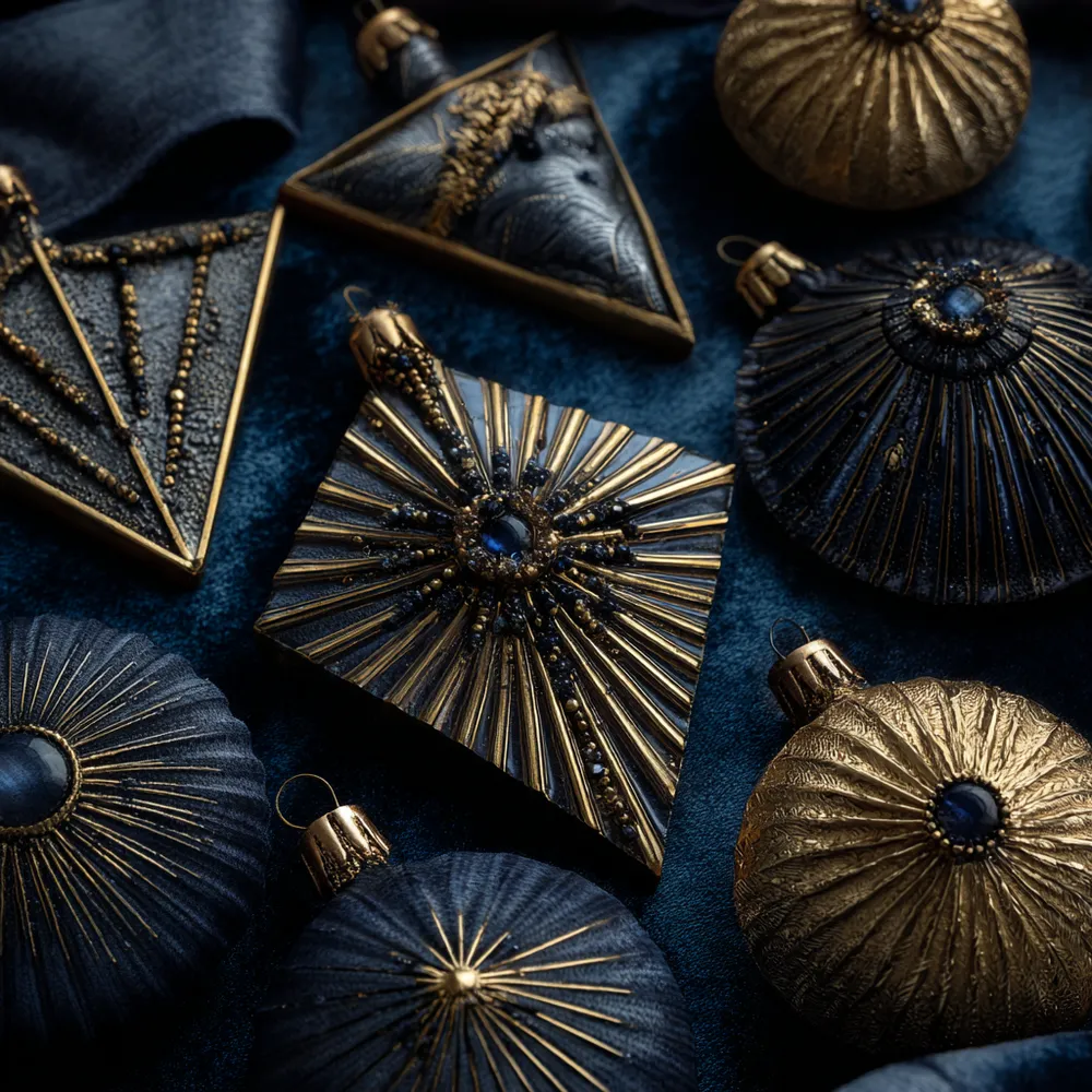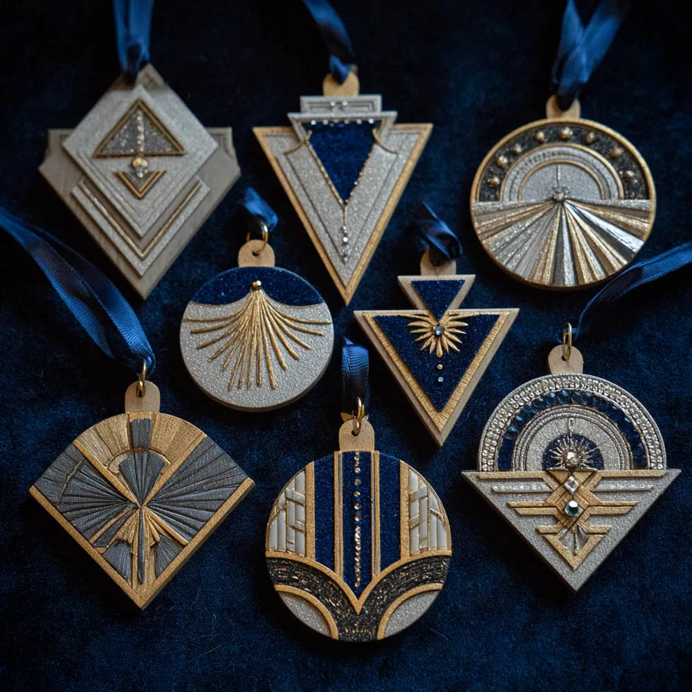 * **Ornamentation:** Geometric shapes (fans, zigzags, sunbursts), mirrored baubles, and vintage-inspired figurines.