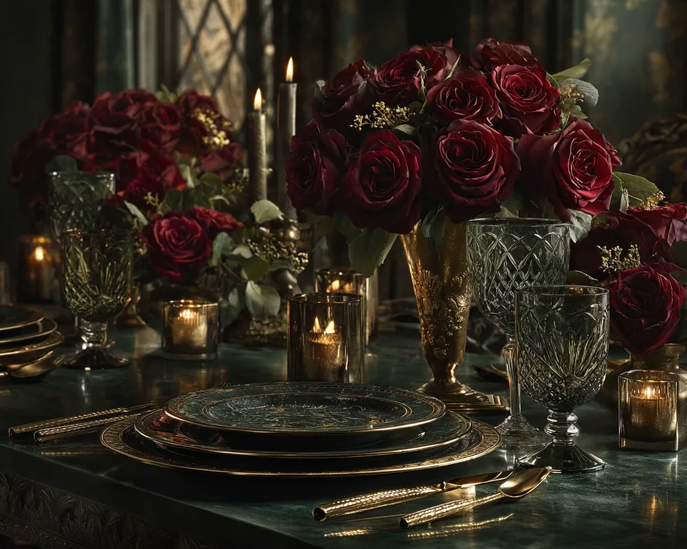 * **Color Palette:** Gold, silver, black, emerald green, sapphire blue, and ruby red.
