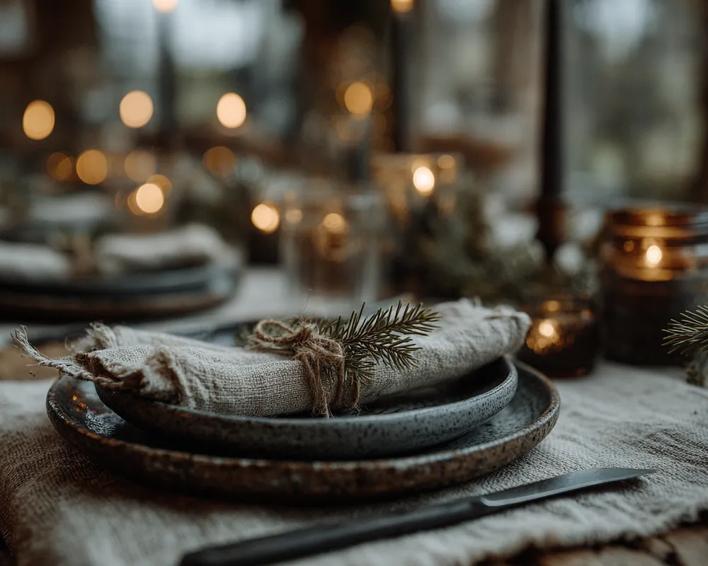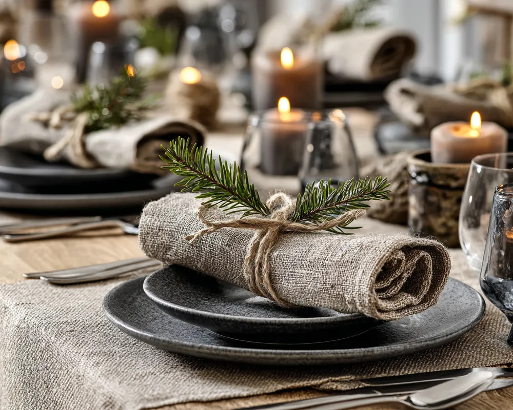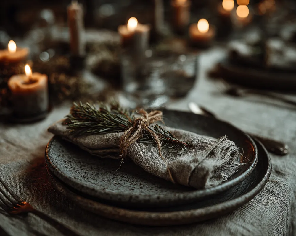 * **Delicate Greenery:** A single sprig of rosemary or evergreen at each place setting.