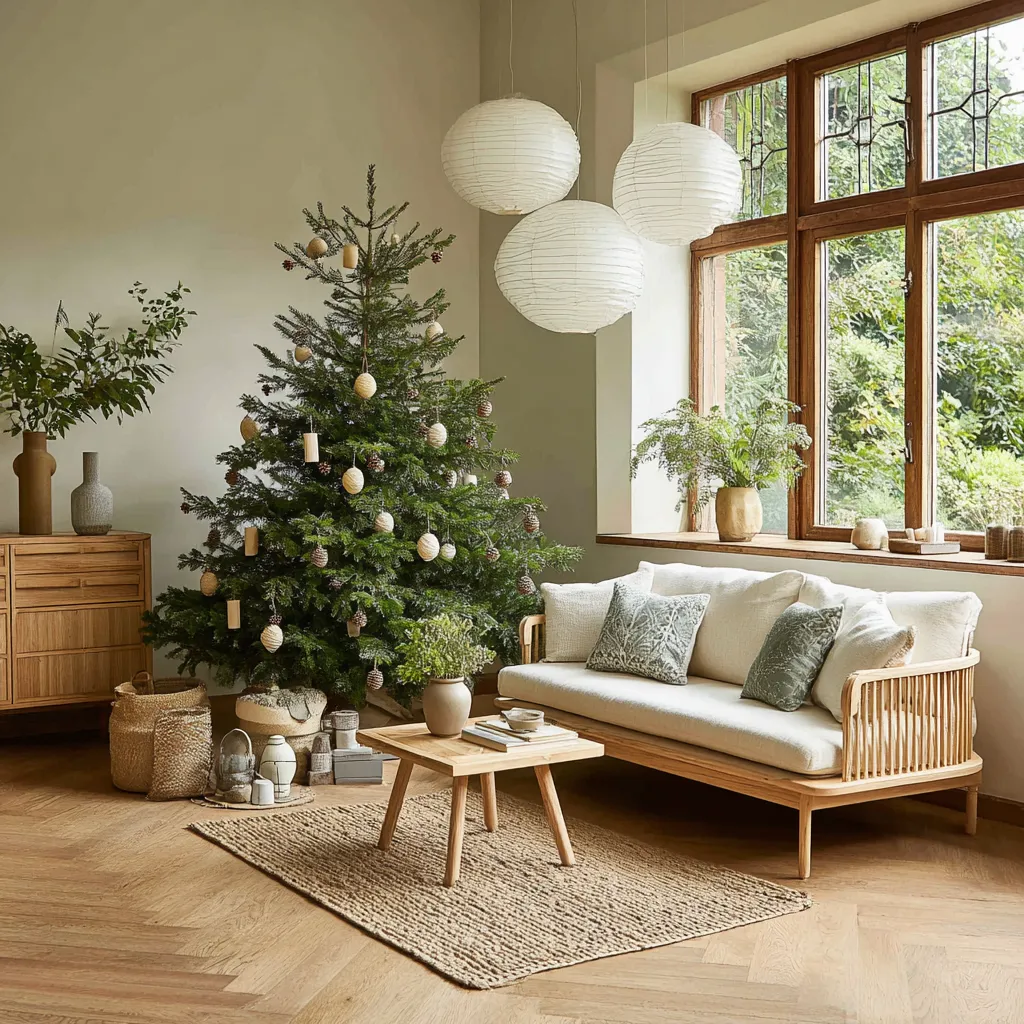 Embrace this style by using natural wood ornaments, simple green branches (like pine or eucalyptus), and delicate paper lanterns for a soft glow. Keep the color palette muted with touches of deep green, cream, and natural wood tones. Focus on texture and mindful placement to create a serene, inviting atmosphere.