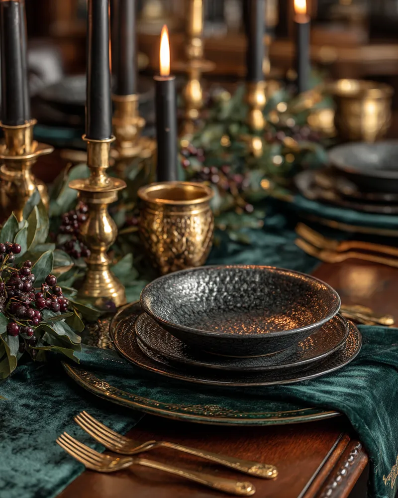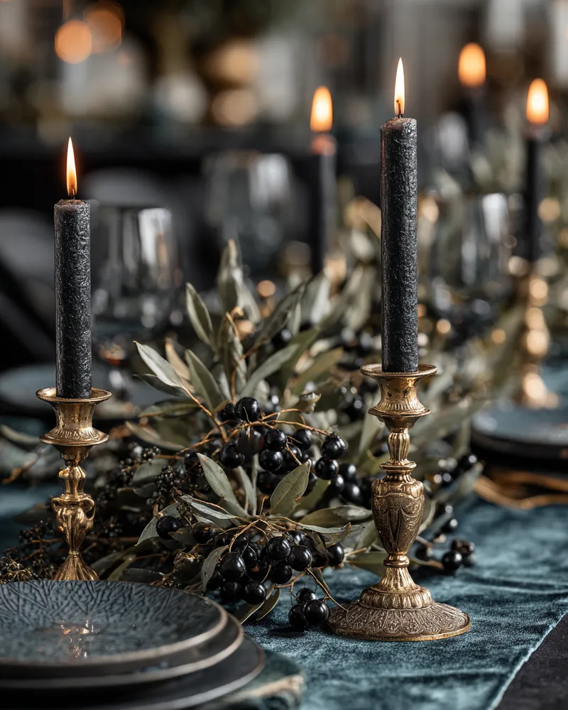 * **Soft ambient lighting:** White tapered candles in clear glass or brushed gold holders.