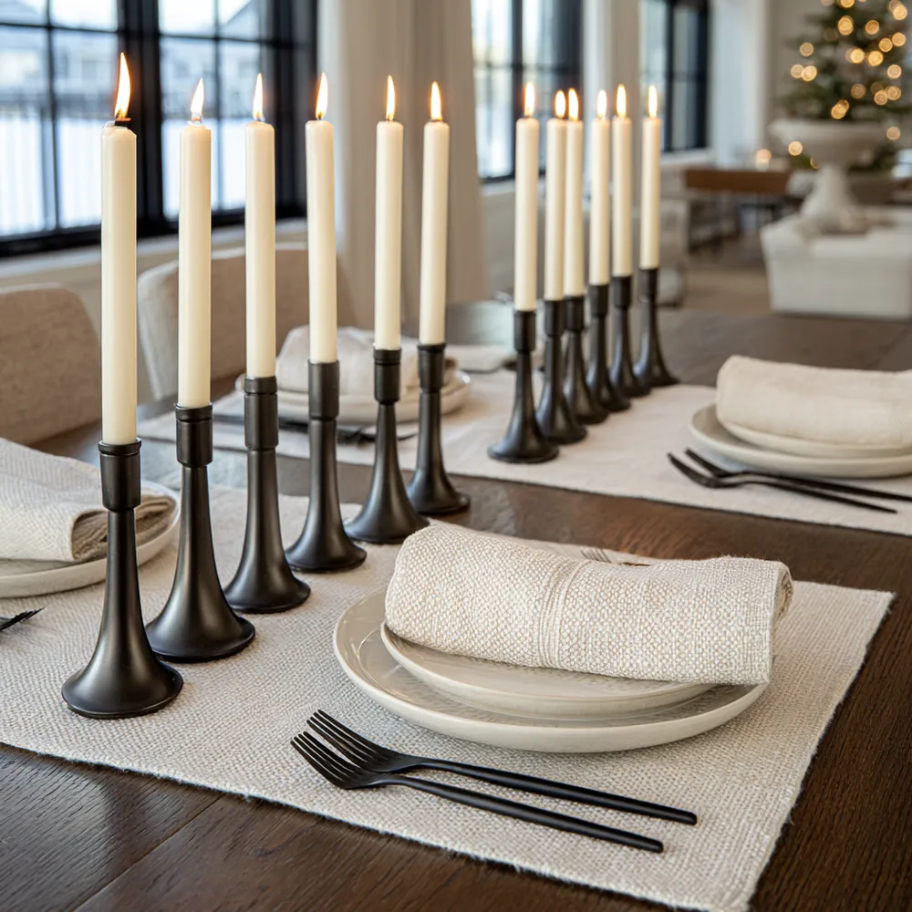 Candles are key for ambiance – opt for unscented, tall tapered candles in elegant holders. Save this for your stunning holiday tablescape! #ChristmasTablescapeIdeas#HolidayDiningIdeas#ElegantChristmasIdeas#ArtfulEntertainingIdeas#UniqueDecorIdeas#FestiveTableSetting#HomeDesignInspo#DinnerPartyDecor#ArtfulHome#HolidayHosting