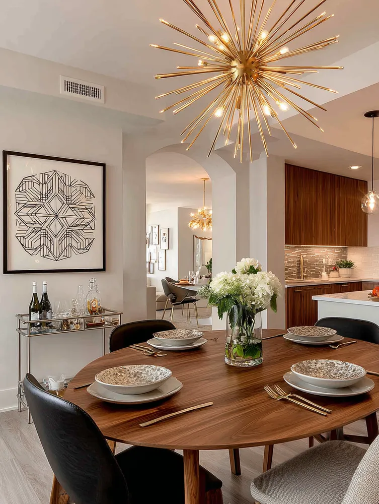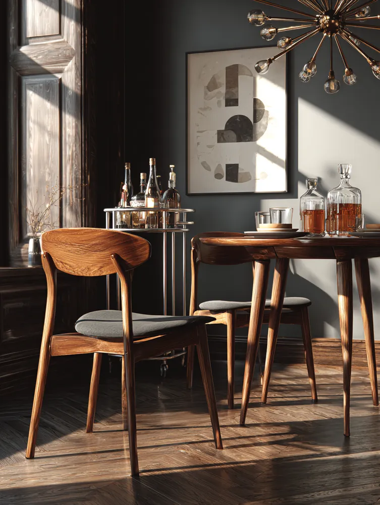 Your dining room is where gatherings happen. Make it timelessly elegant with Mid-Century Modern design principles! ✨ Achieve MCM dining perfection: • **Sculptural Dining Table:** Opt for a walnut or teak table, perhaps with a slightly rounded or oval shape. • **Iconic Chairs:** Comfortable, stylish chairs with tapered legs and molded seats are a must. • **Statement Lighting:** A Sputnik chandelier or a series of globe pendants overhead. • **Minimalist Buffet/Sideboard:** Functional storage with clean lines in a complementary wood tone. • **Subtle Accents:** A centerpiece with a few stems or a minimalist table runner. Create a space for memorable meals! 🥂