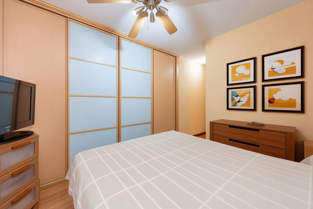 LA GUARDIA. the modern bedroom has a big bed and a beautiful window