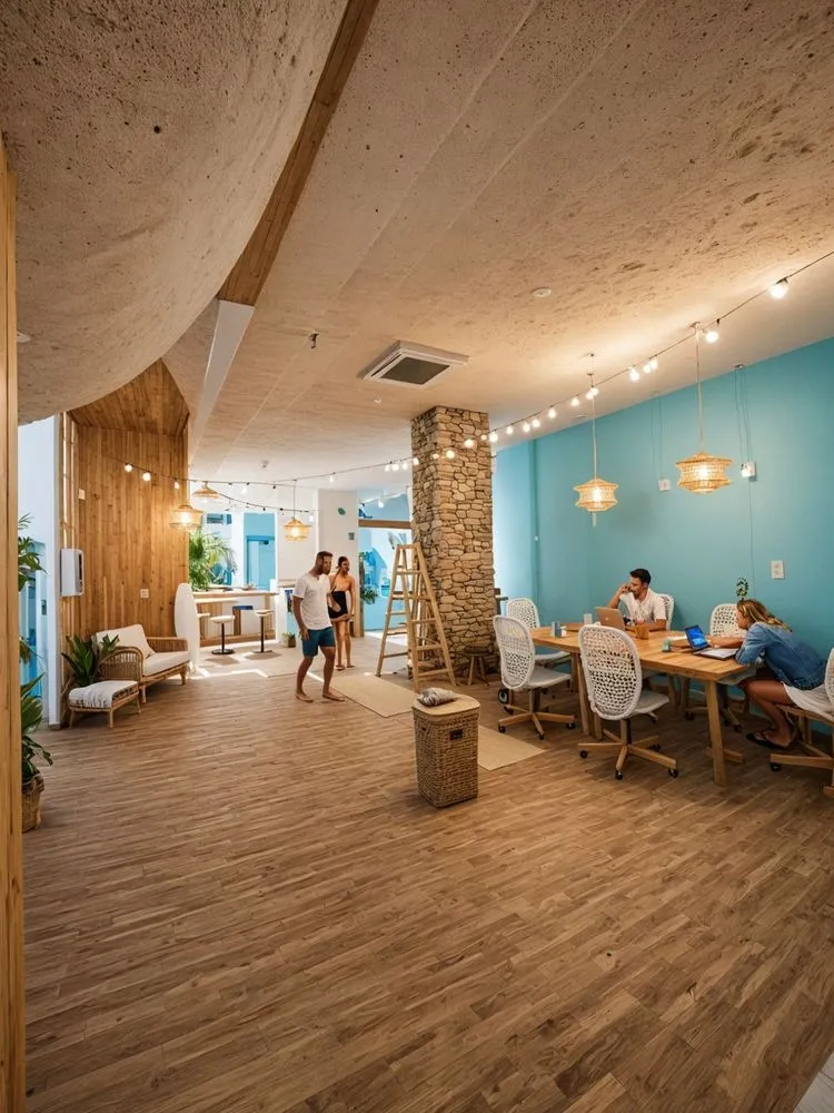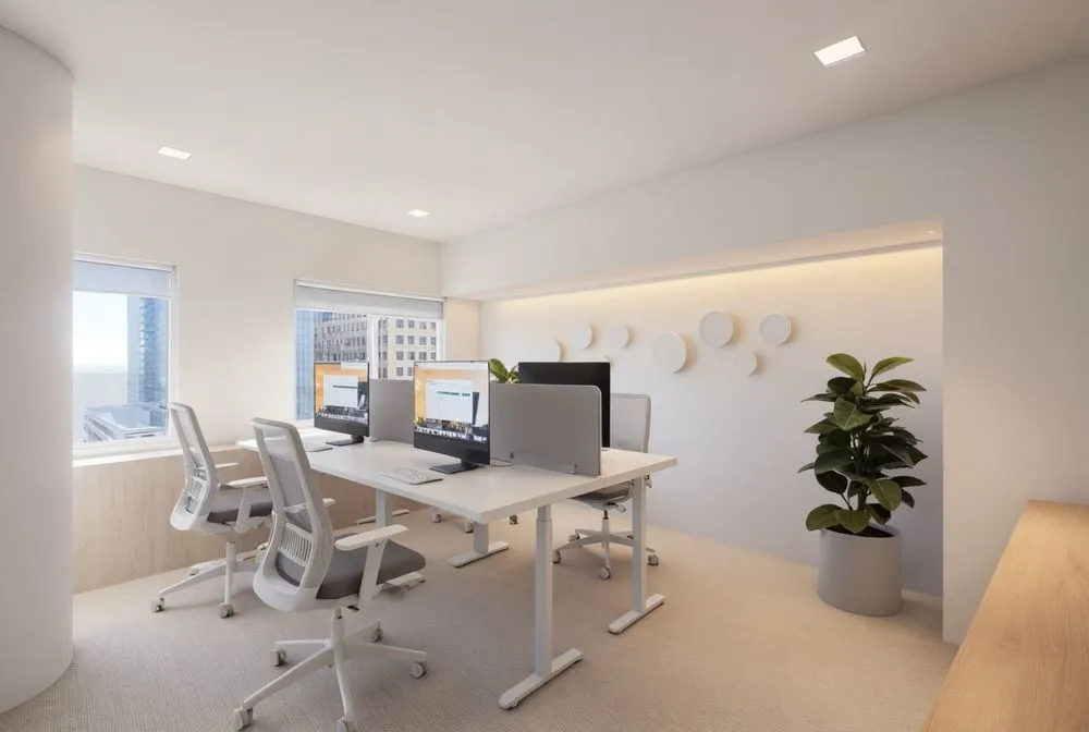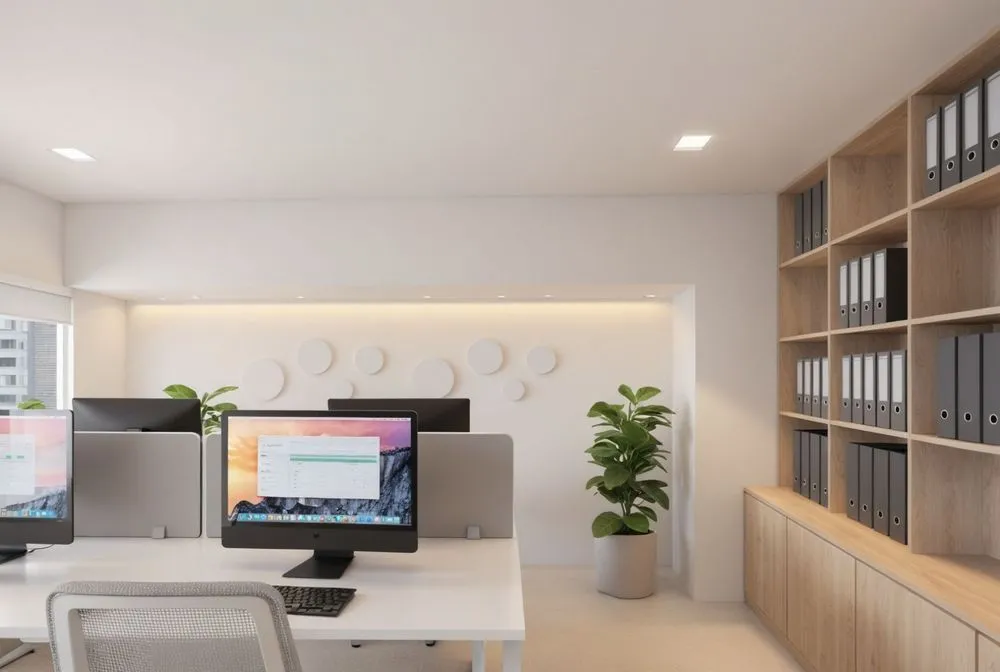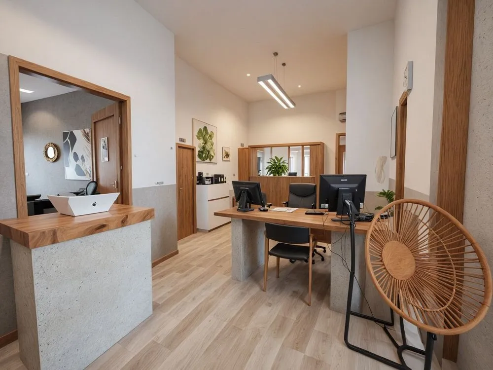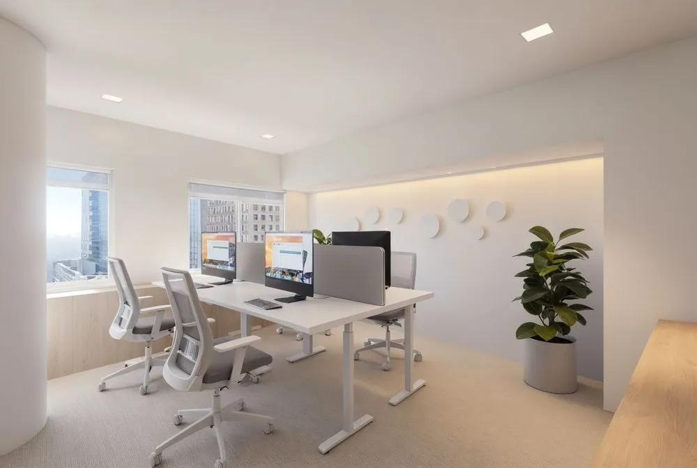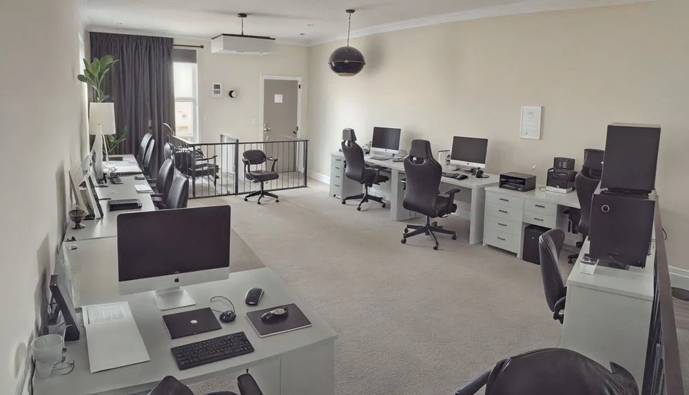 office with multiple computer desks and chairs and a large white chair in front of a fireplace