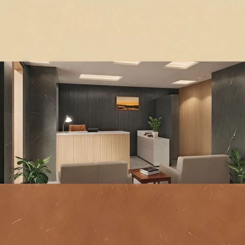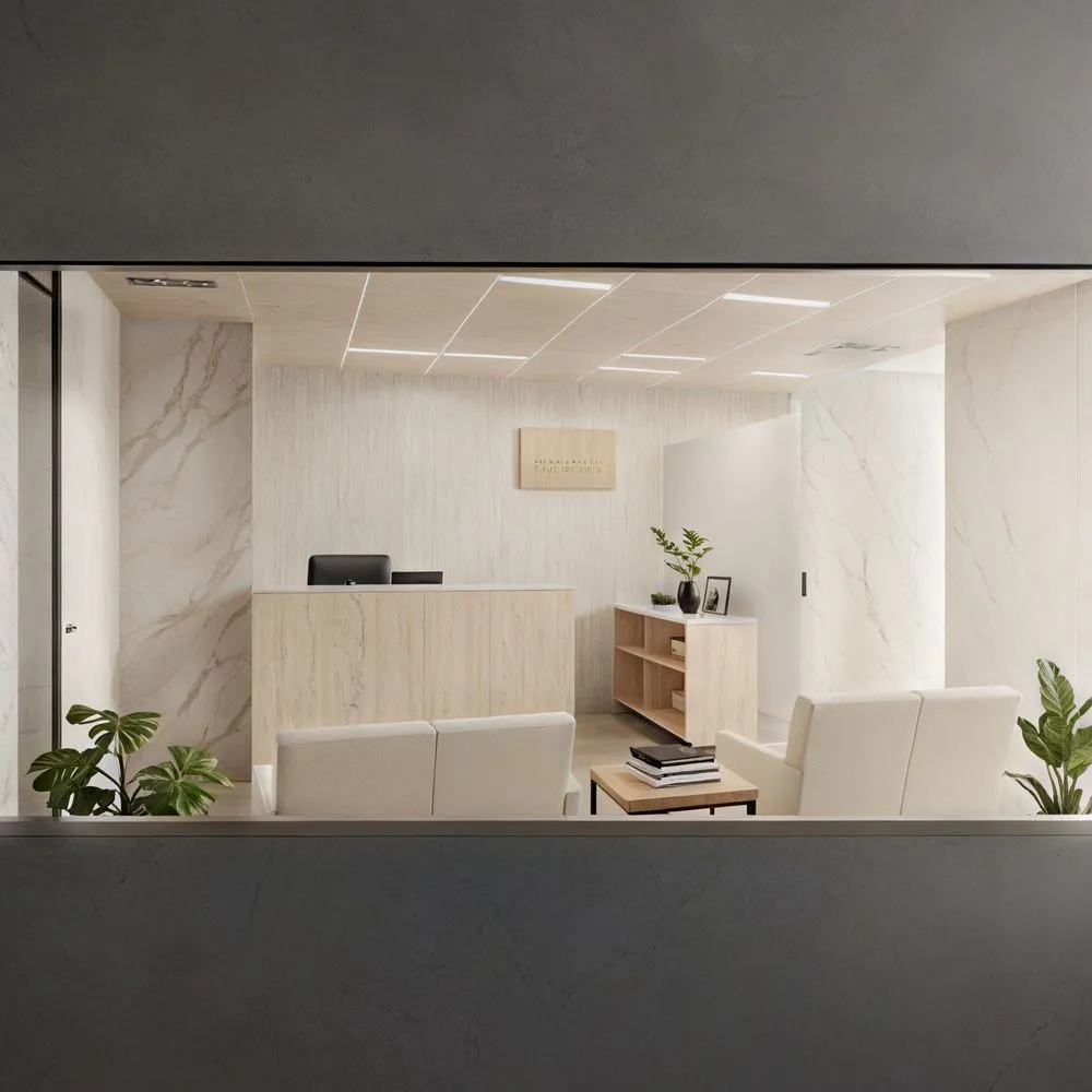 office waiting room with the light on as well as plants and modern furniture Modern Office 48" x 60" High Pile Carpet .25" Thick T-Shape Chair Mat w/Beveled Edges Mocha 5-Piece Office Furniture Package White 4-Piece Office Furniture Set Creative Sound Blaster Katana V2 RGB True 5.1 MULTI-CHANNEL Gaming Soundbar with Subwoofer, ft. Tri-Amplified 5-Driver Design and Super X-Fi