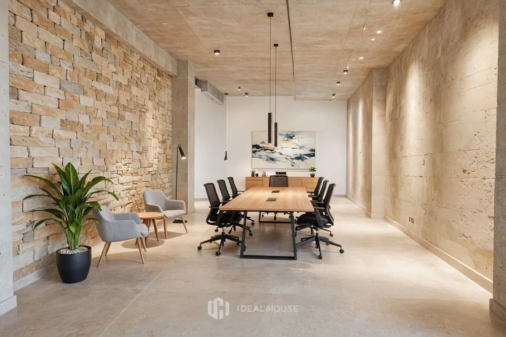 a long rectangular table surrounded by chairs sits in front of a wall with bricks