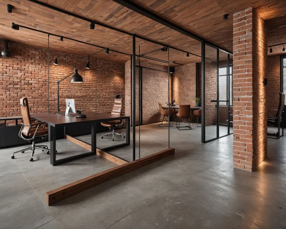 a room with brick walls, hardwood floors and a ceiling with a dome light