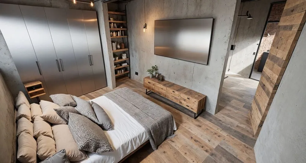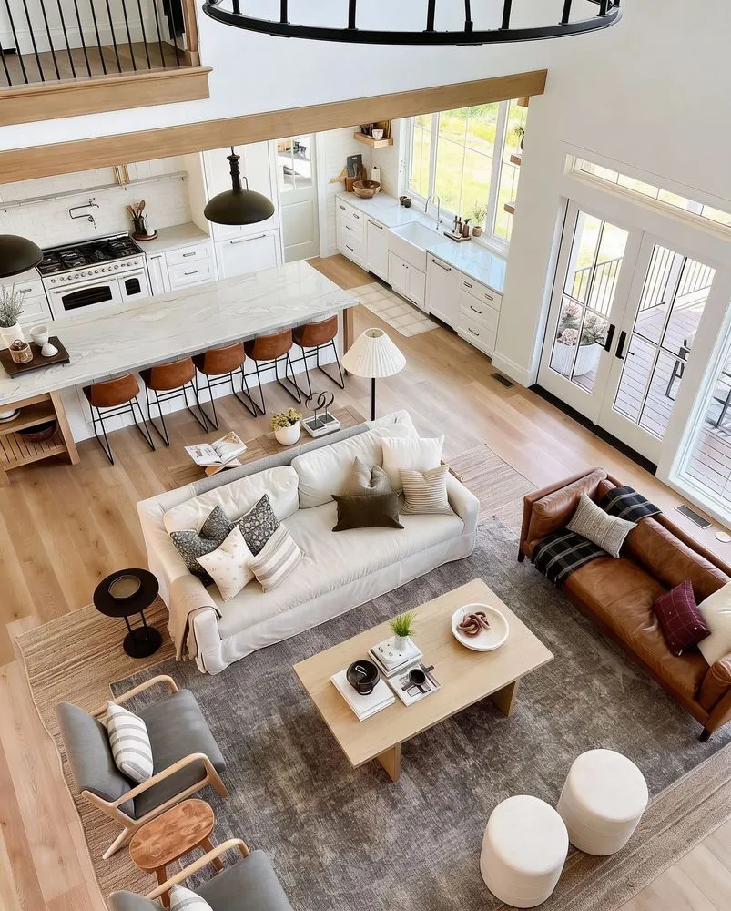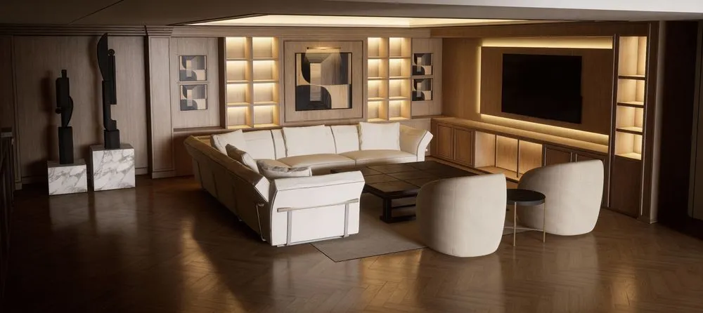 a room with white and black marble walls, gray furniture, and a black marble staircase
