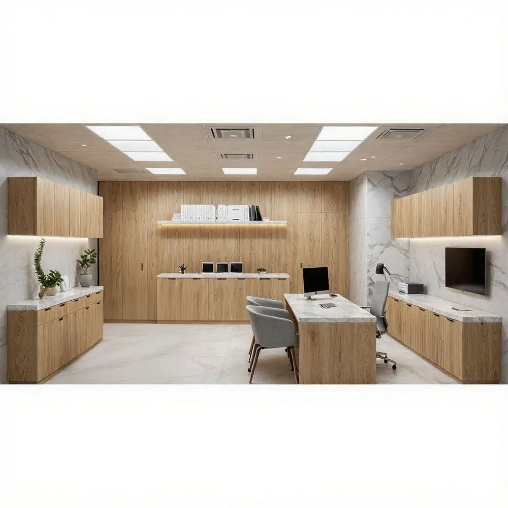 a modern office features white marble walls, a wooden table and cabinets