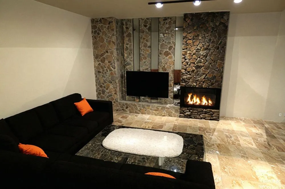 modern living room with fire and high - tech lighting