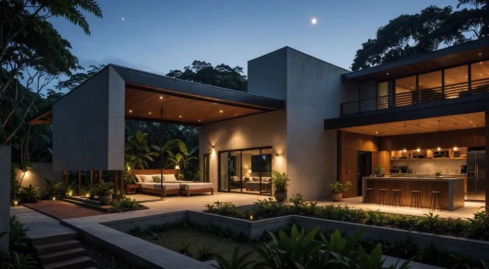 modern apartment building with low light in evening