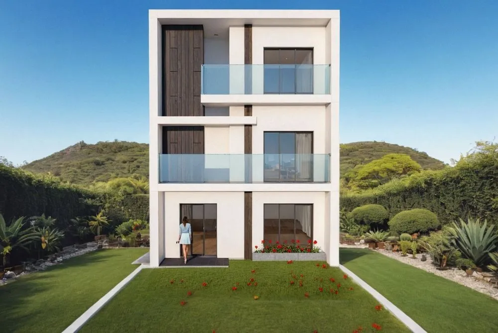 the modern architecture in the background features concrete siding and windows