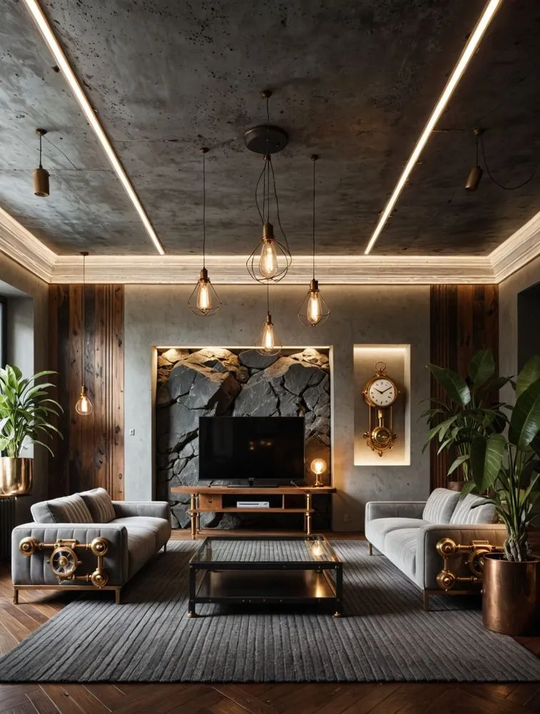 a modern style living room with wood floors and lights