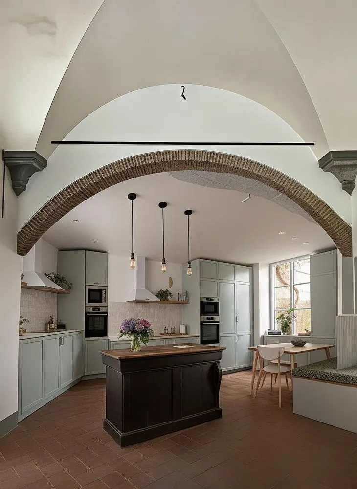 a modern kitchen with a stove and brick archway