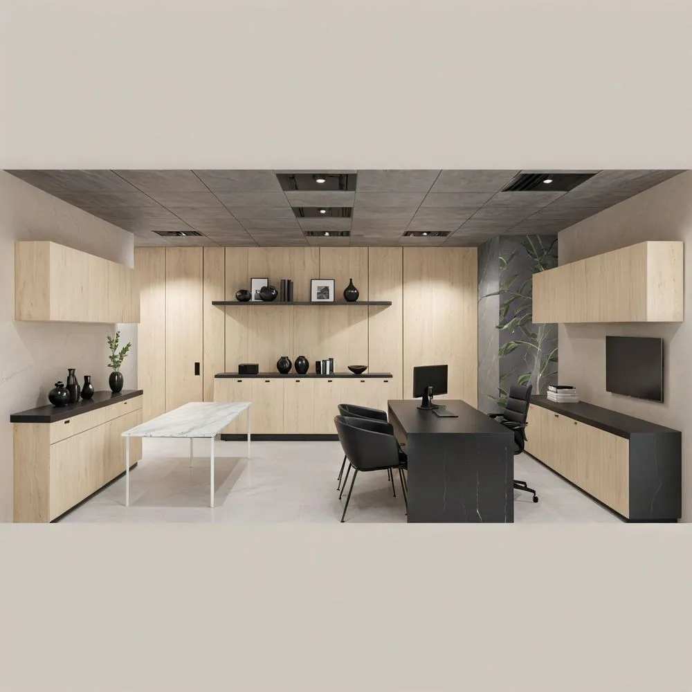 a modern kitchen with white counter tops, stainless appliances, and wooden cabinets