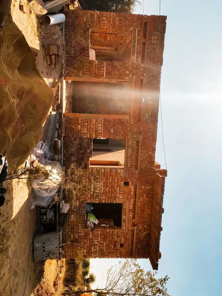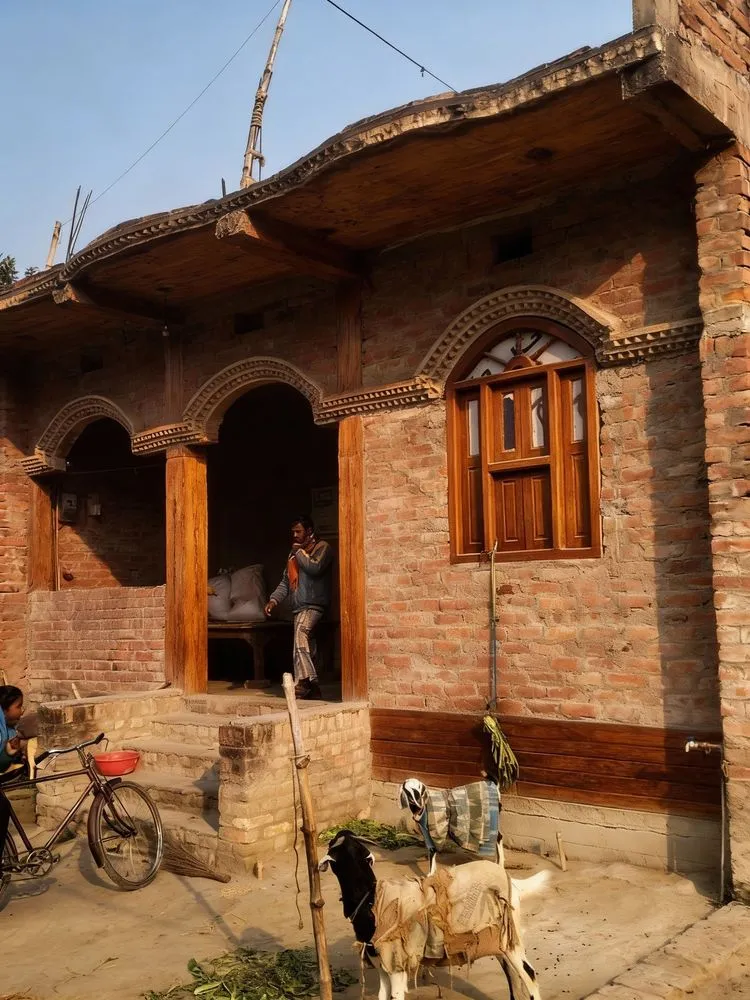 this is a small old brick home with some wood doors and window frames