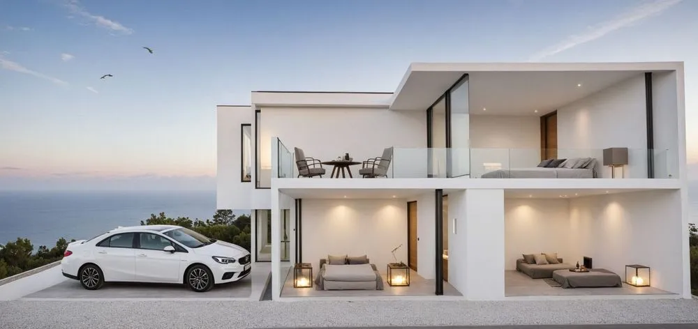 a modern home with a white car parked in front