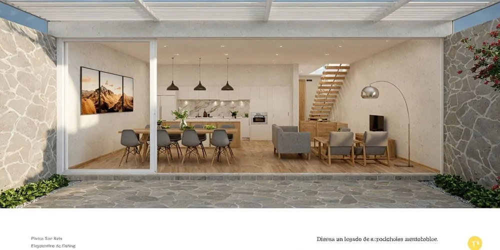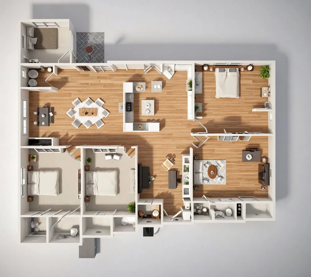 a drawing of a house from above, with cars parked in the yard and stairs on top of the house
