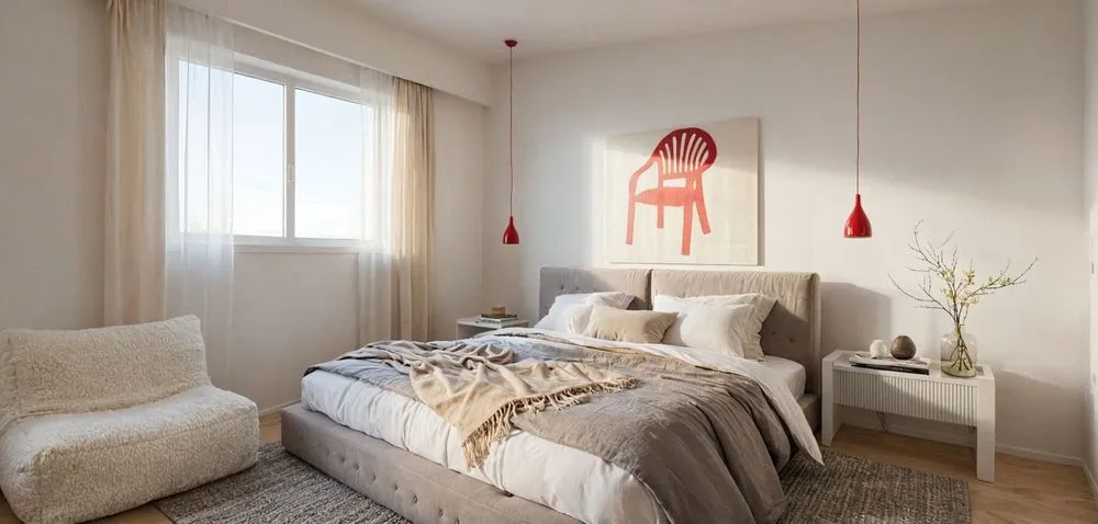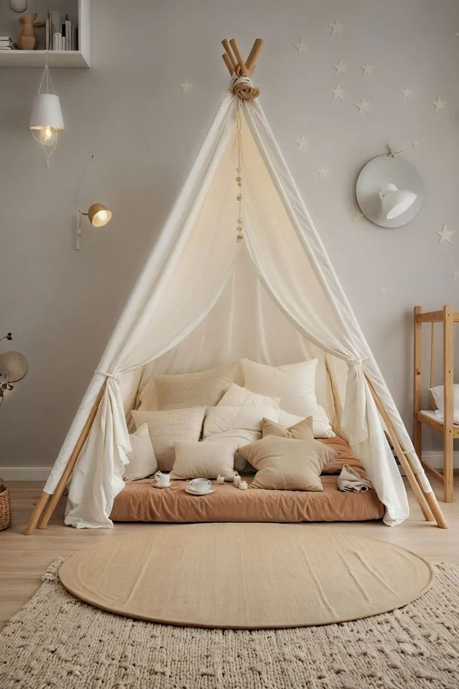 a teddy bear in a white armchair sitting on the wall of a nursery room