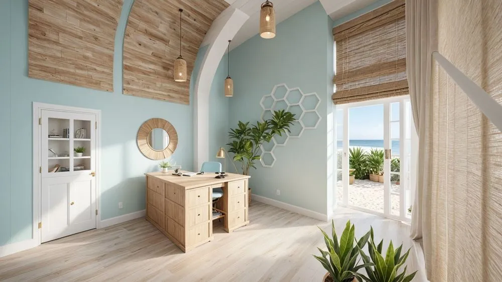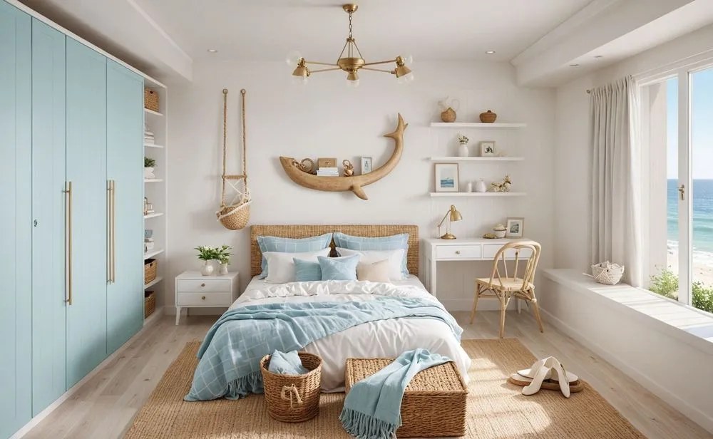 a boys'bedroom with blue walls, white shelves and a small desk with a toy basketball on it