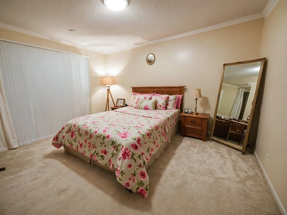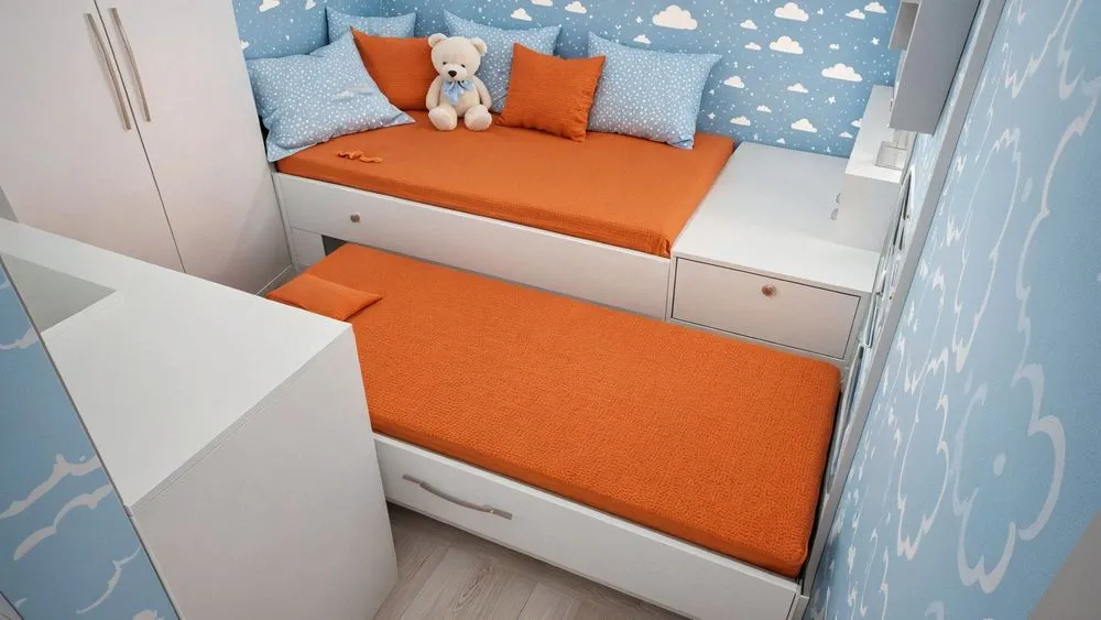 a kids'bedroom with pink rug, wooden furniture and walls painted in pale blue