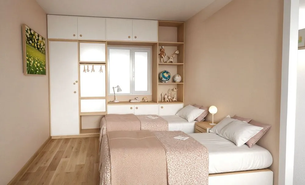 s bedroom with twin bed and desk, wooden floor, drawers, built in shelf, bookcase on wall