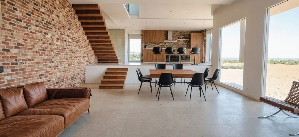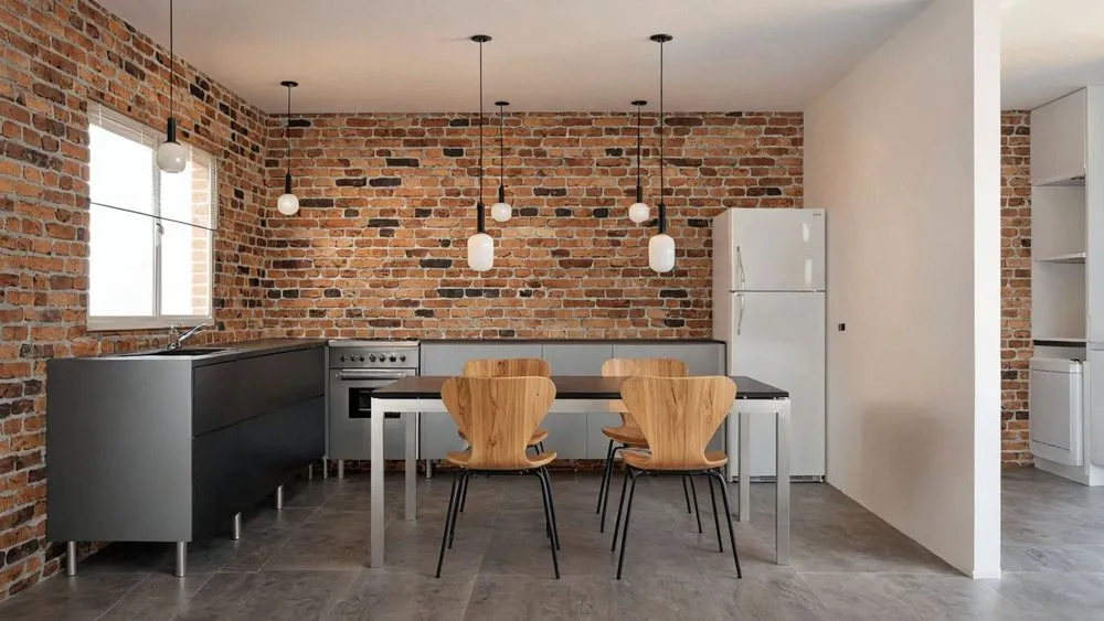 a brick wall and a large table are set in a spacious dining room