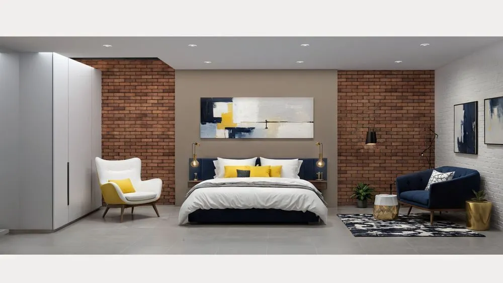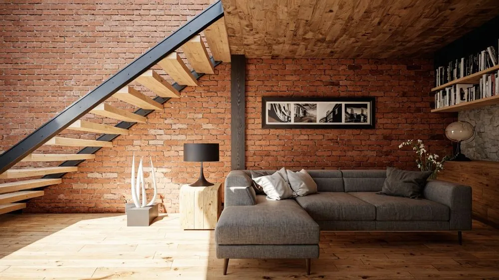 a chair in a room with brick walls and flooring