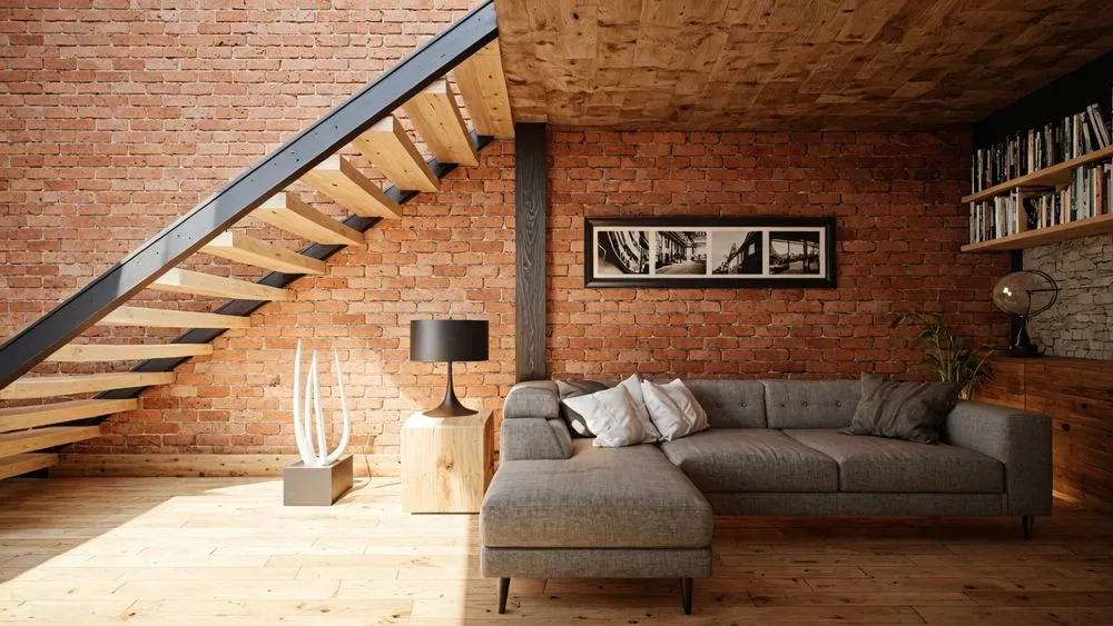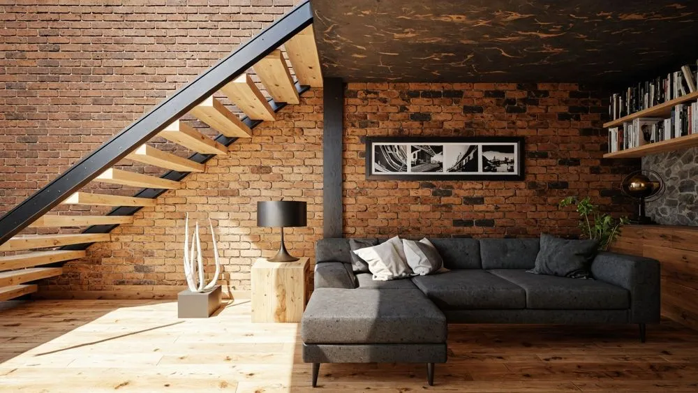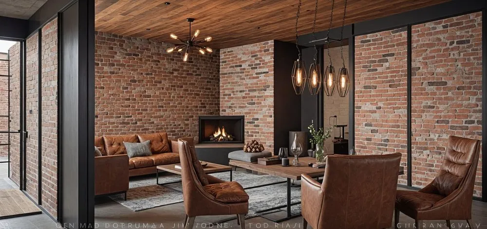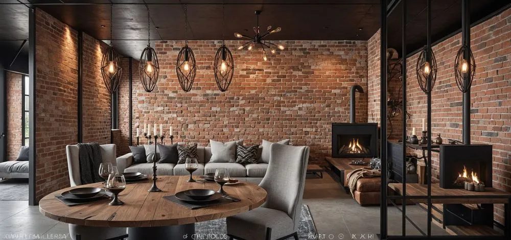 a room with black iron and brick walls, wooden furniture, and large windows