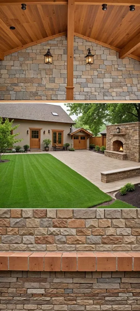 three images show brick and stone house in backyard