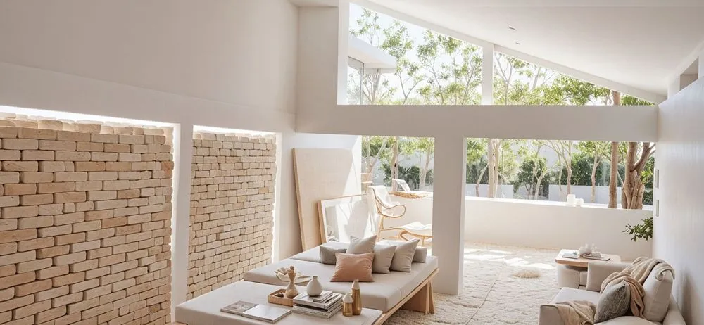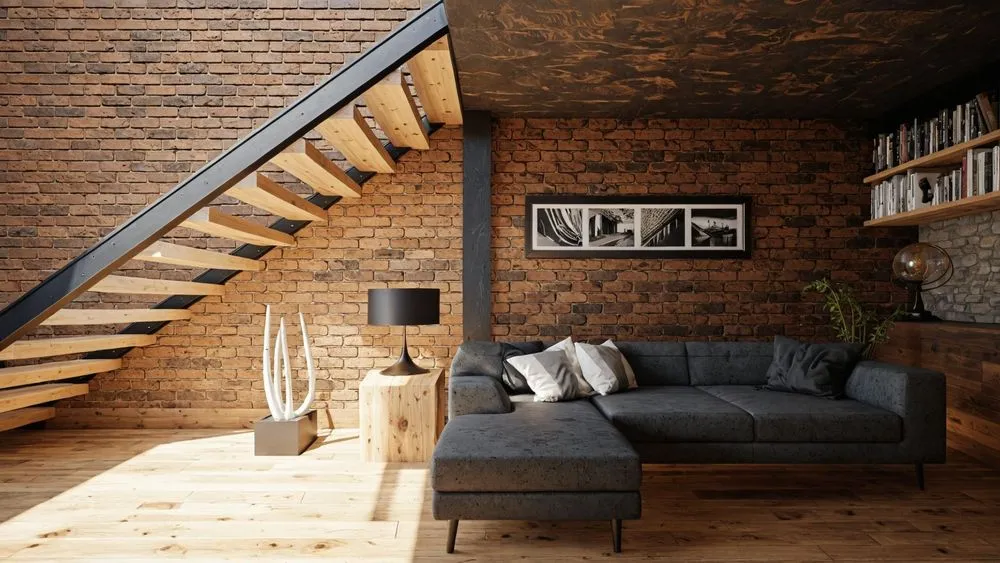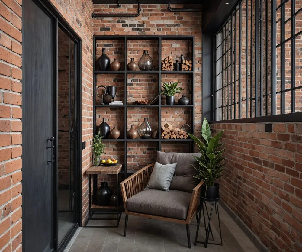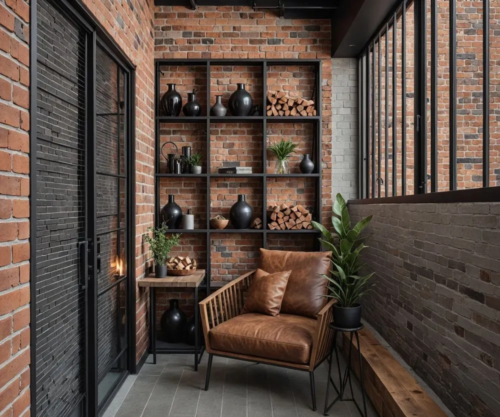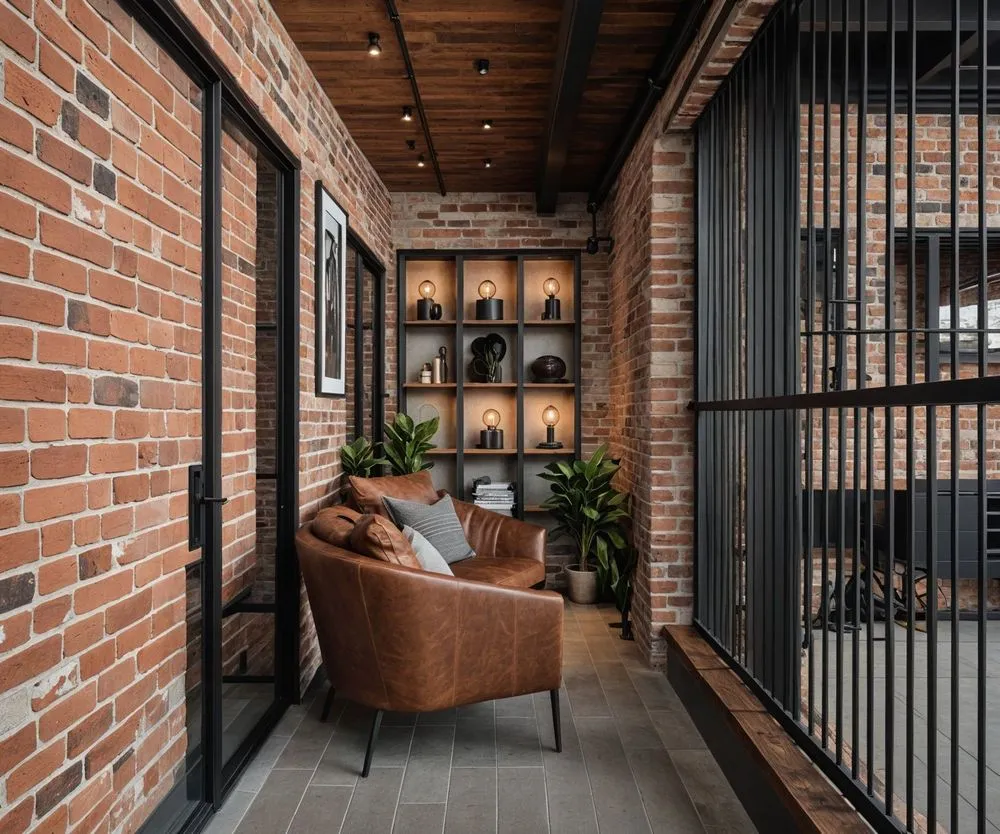 a living area with brick walls, plants and a leather chair
