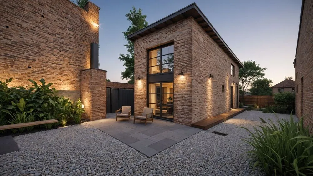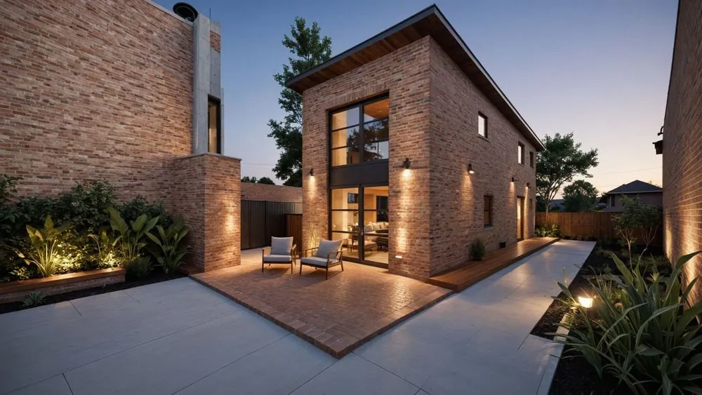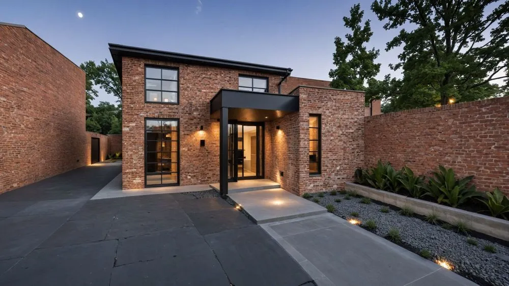 the courtyard and brick facade of this contemporary home