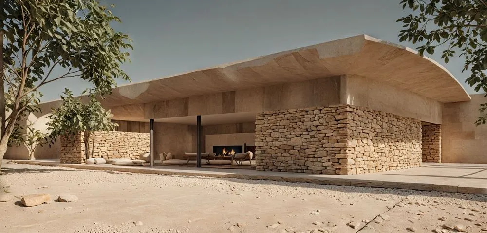 the desert house features stone walls and a patio
