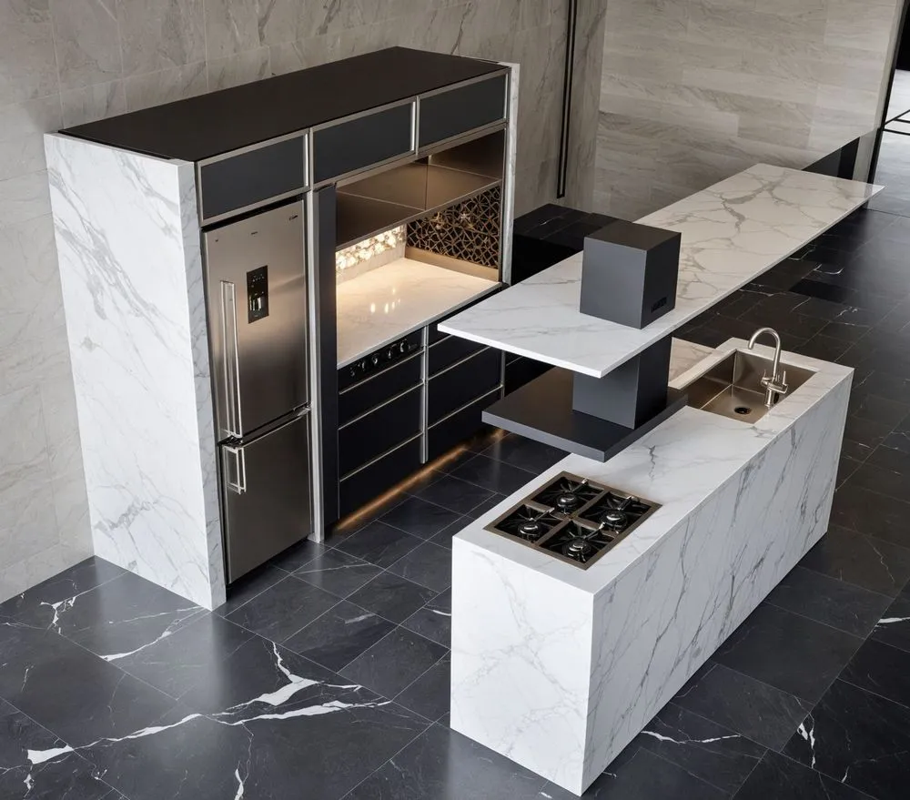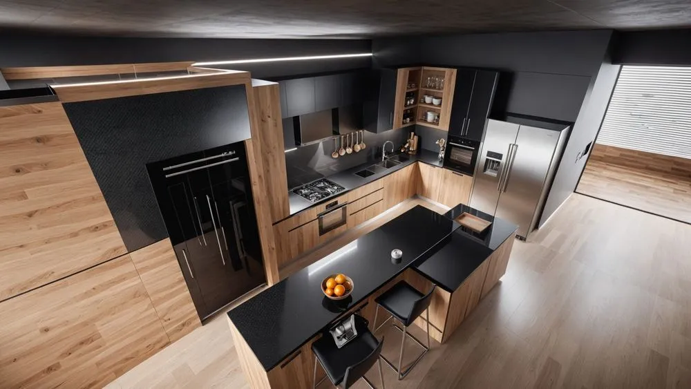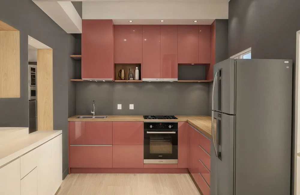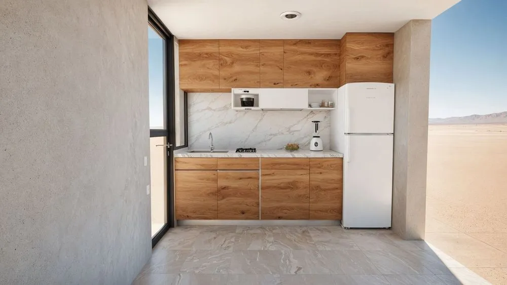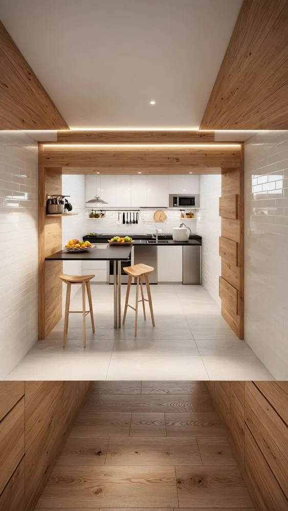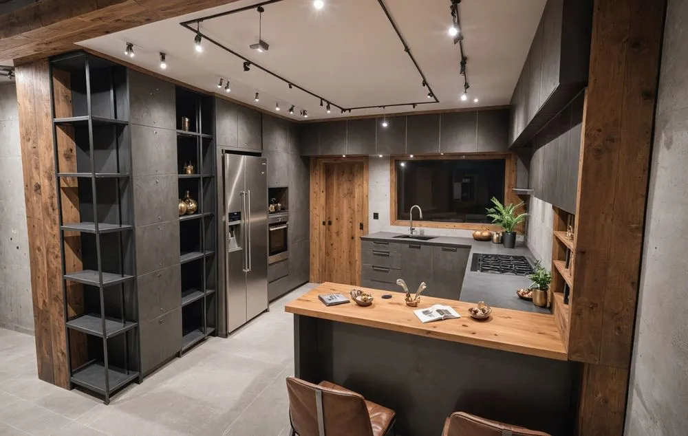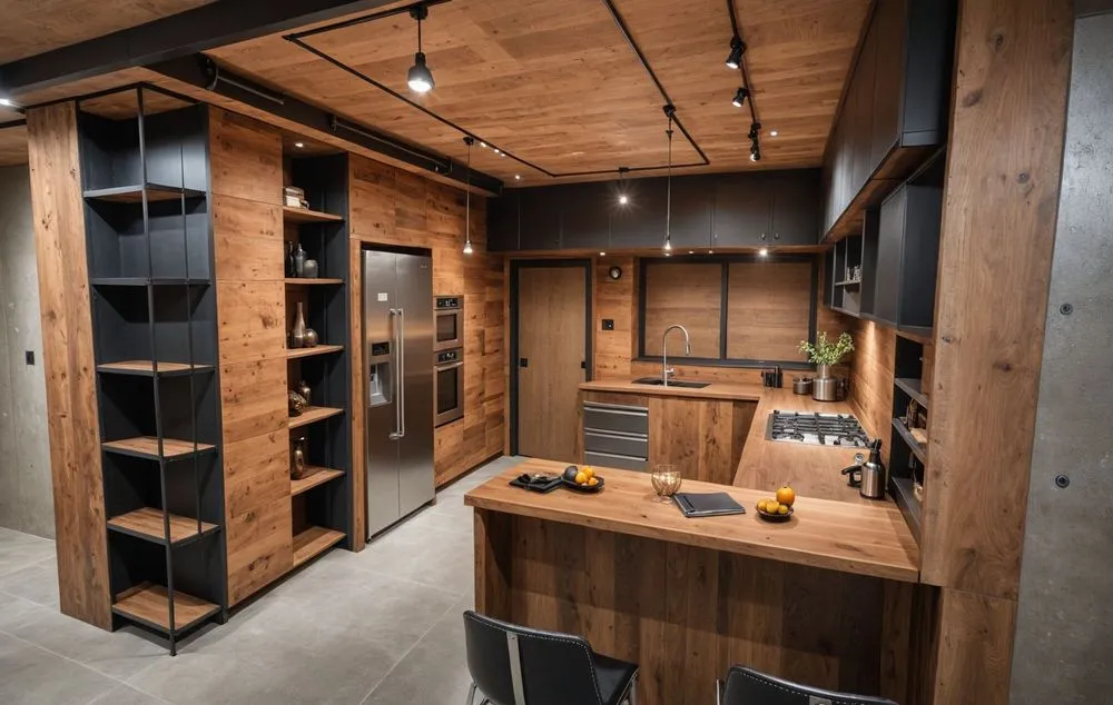 the kitchen is equipped with a large wooden table and stainless steel refrigerator