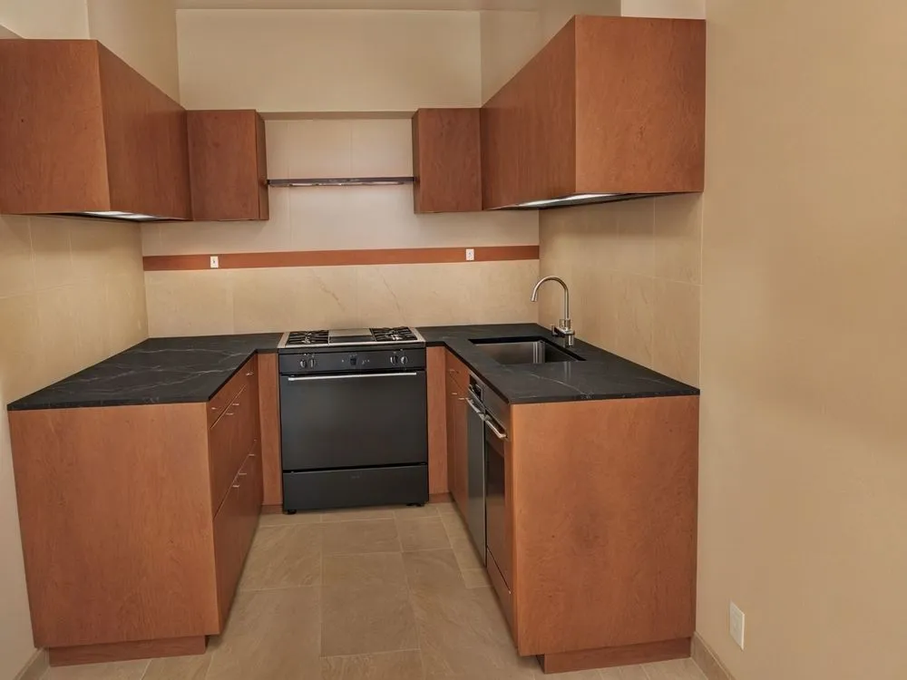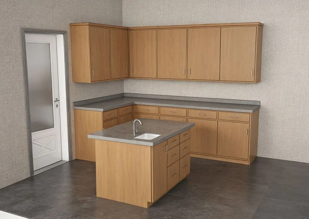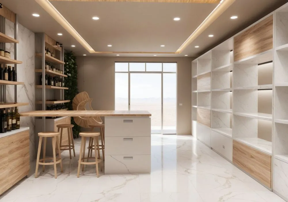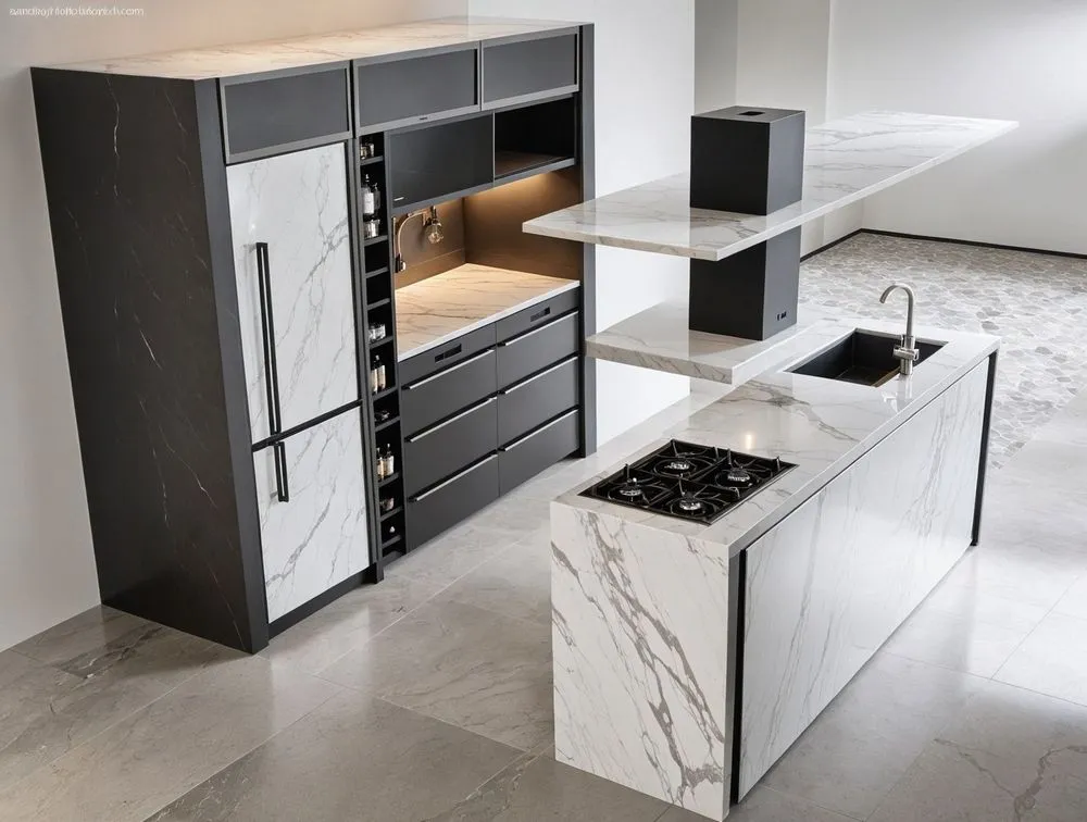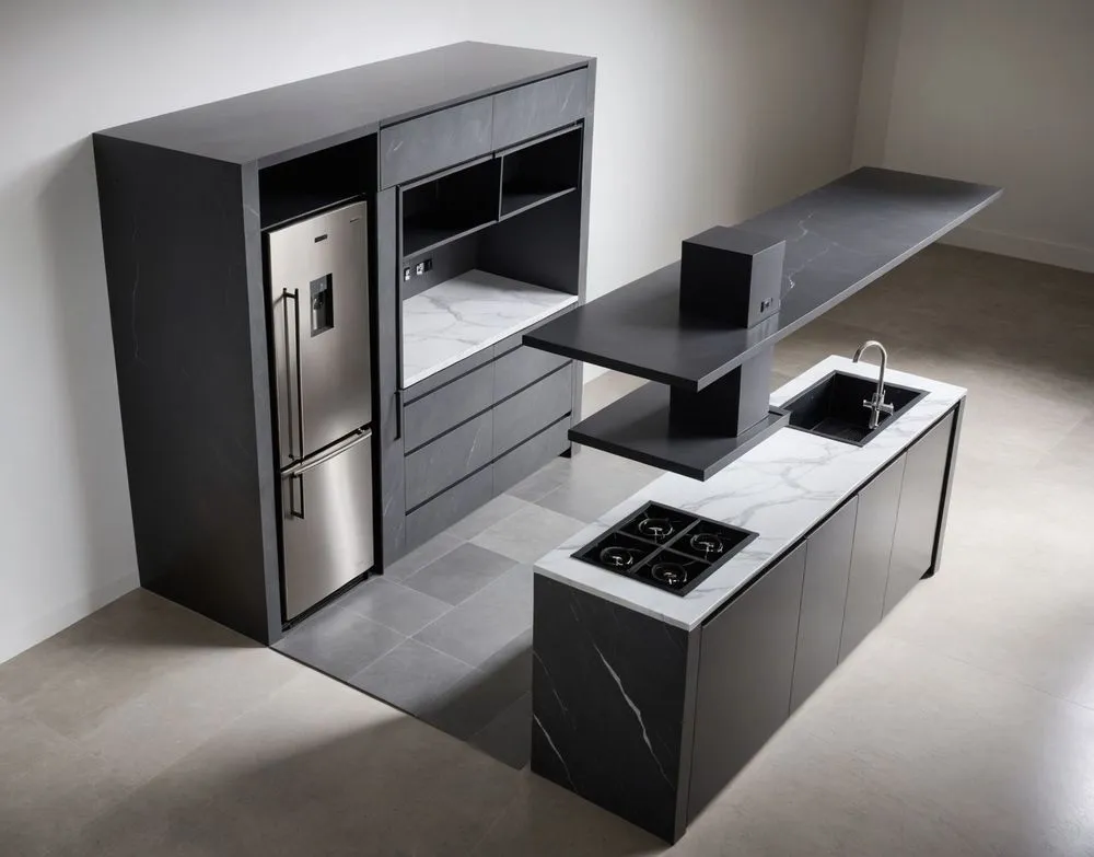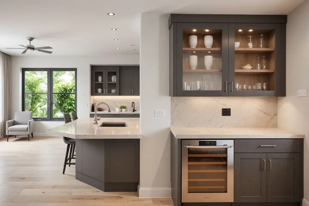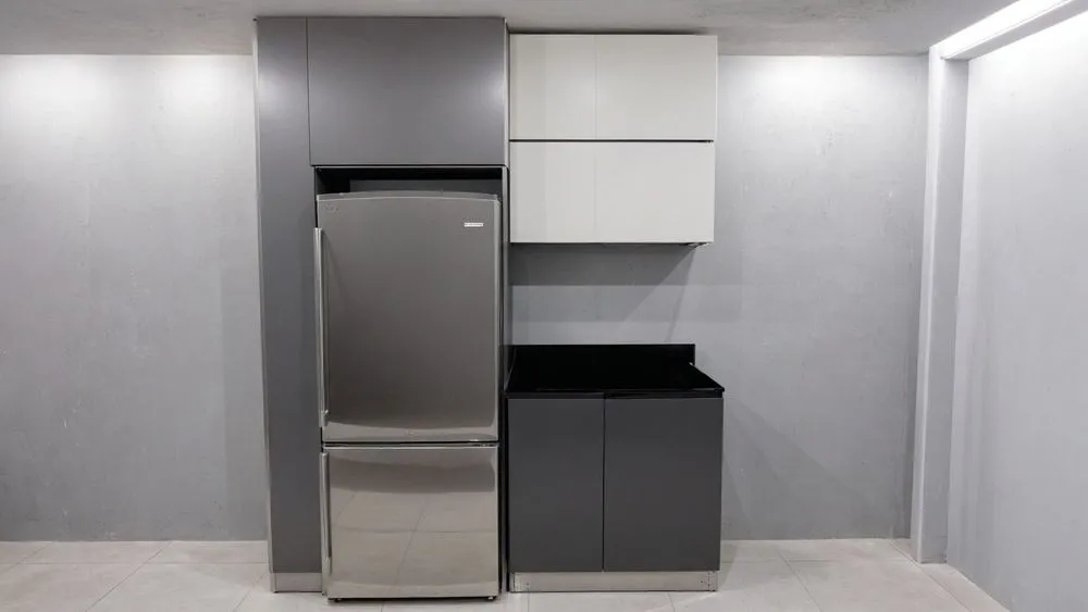 the kitchen is equipped with a large wooden table and stainless steel refrigerator