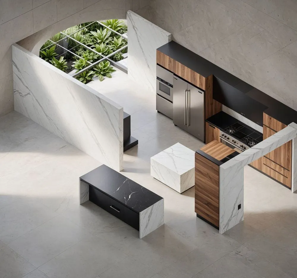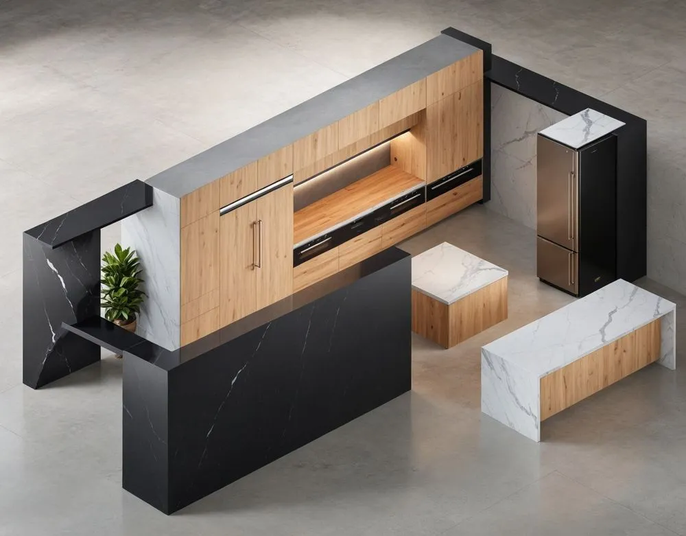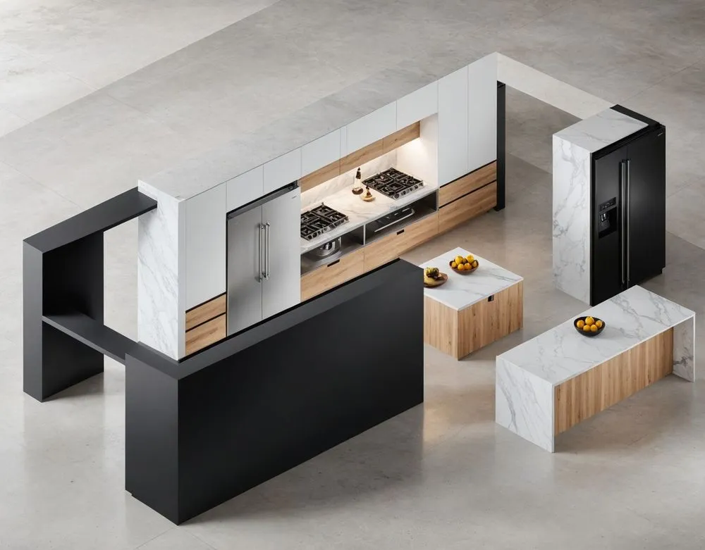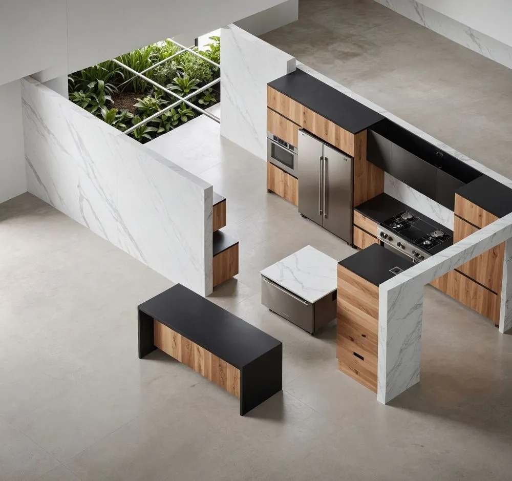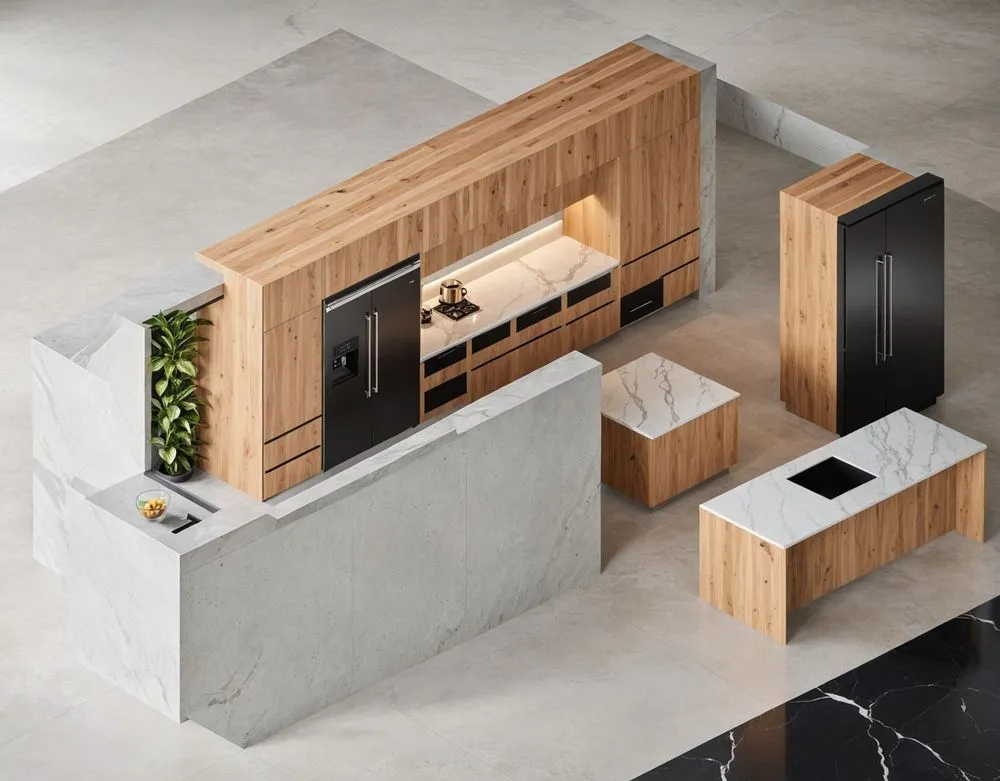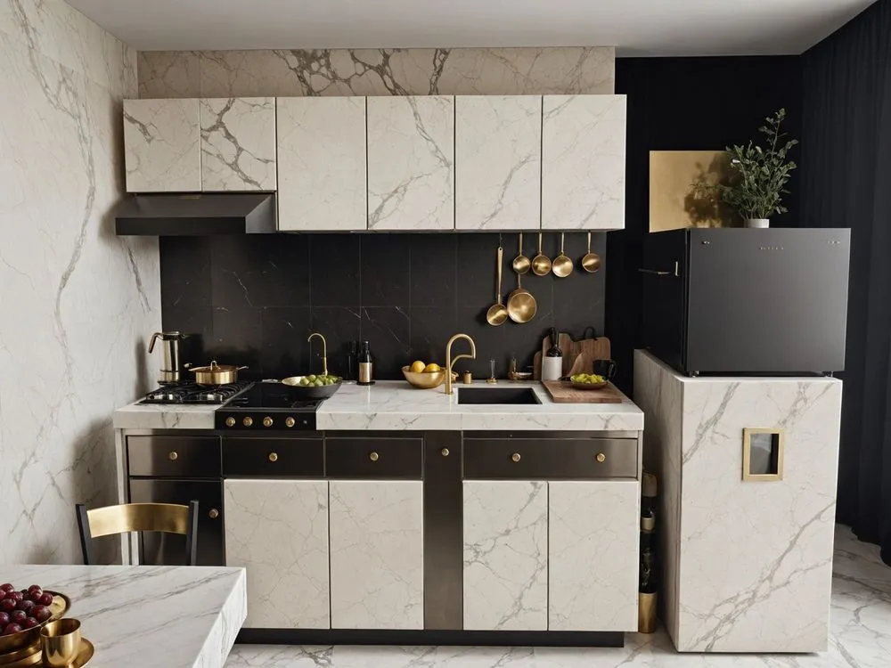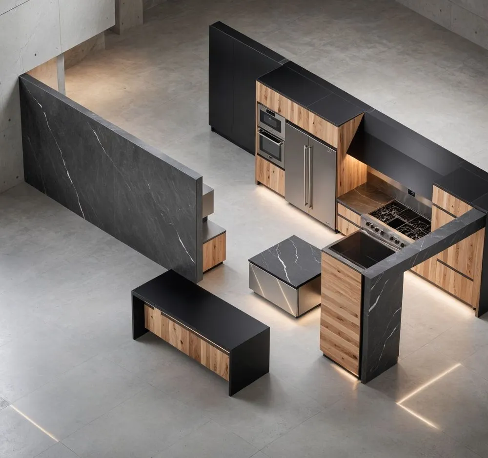 an elegant kitchen design with a black cabinet, wooden countertop and marble sink