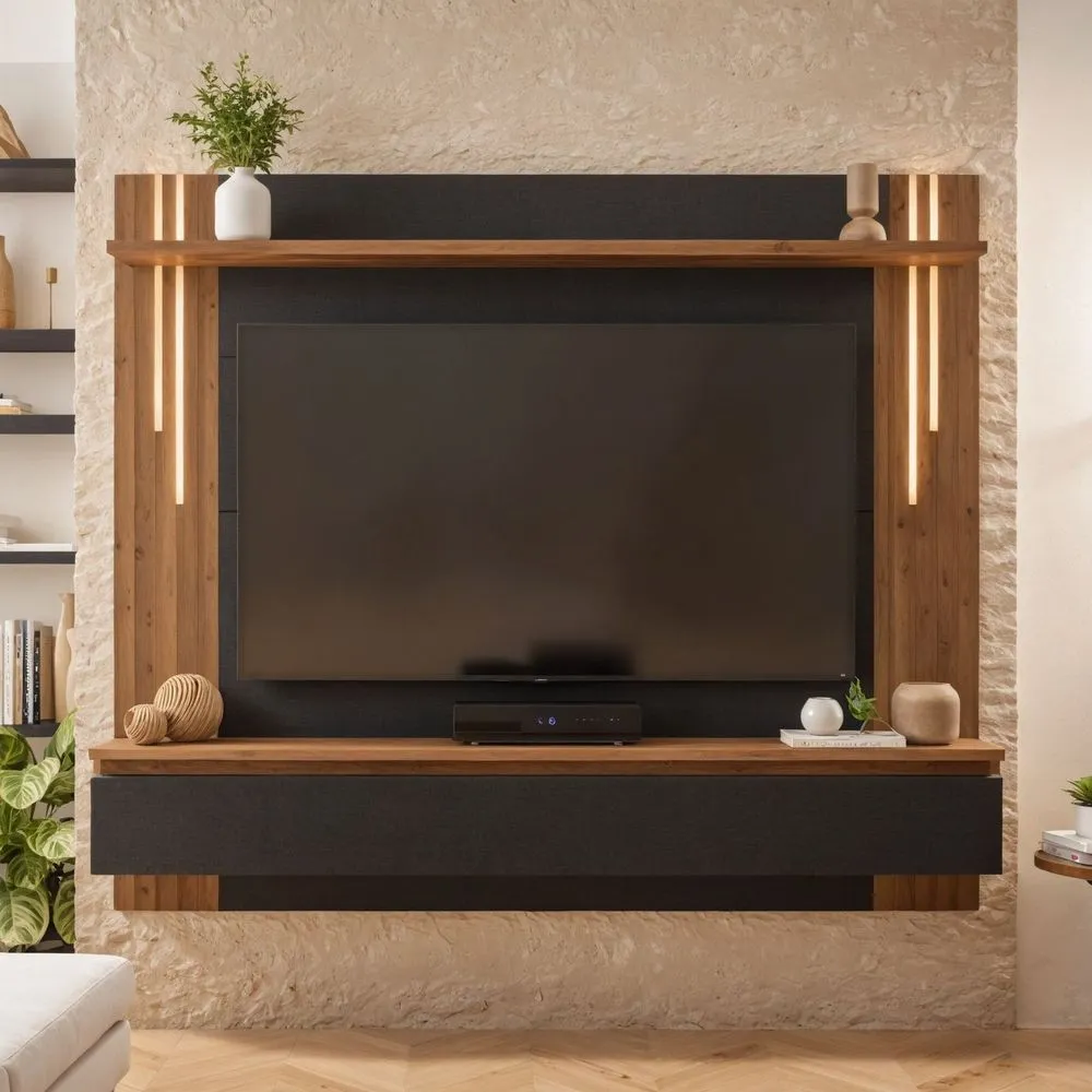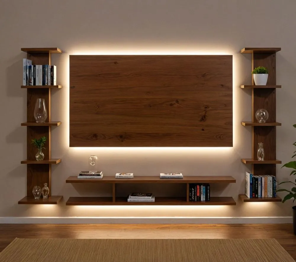 a television in a living room that has a blue wall behind it and is displaying the word arkaan on it