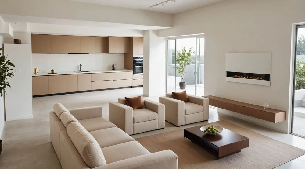an elegant living room with sofa, coffee table, chairs and a wood fireplace