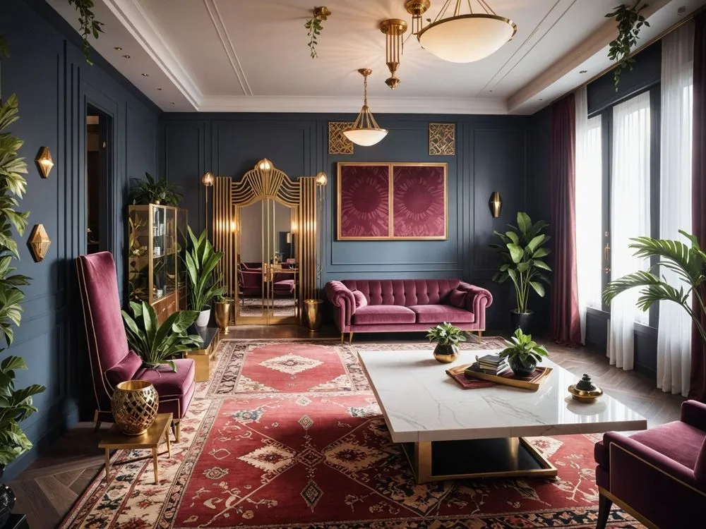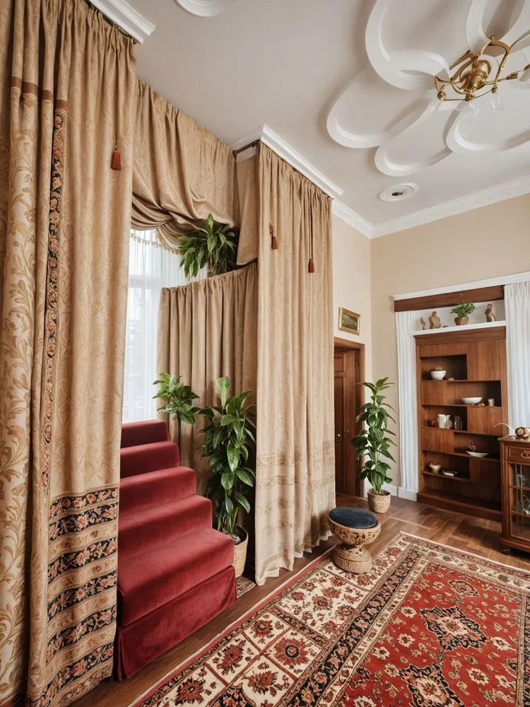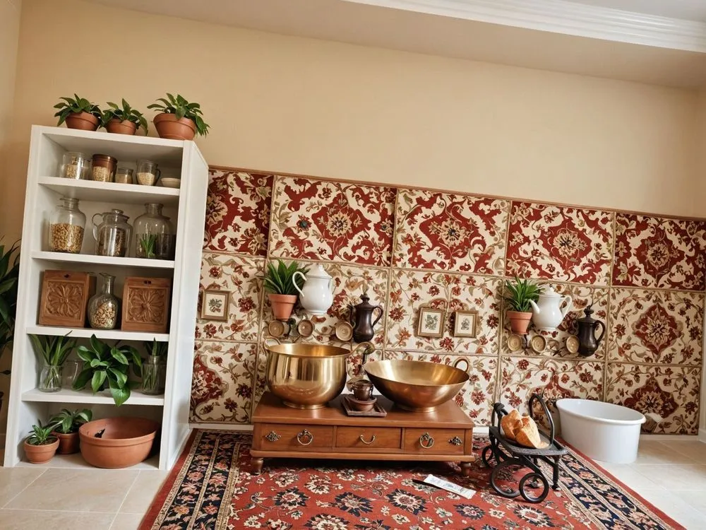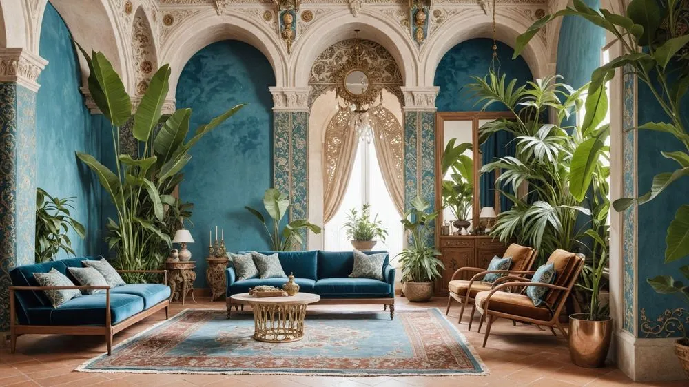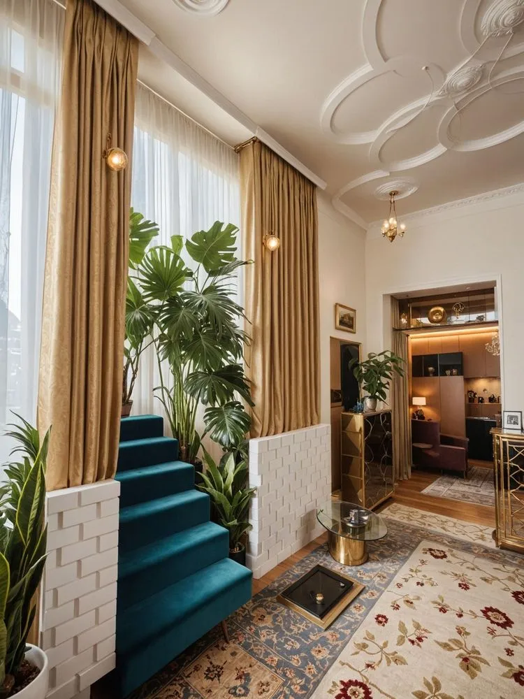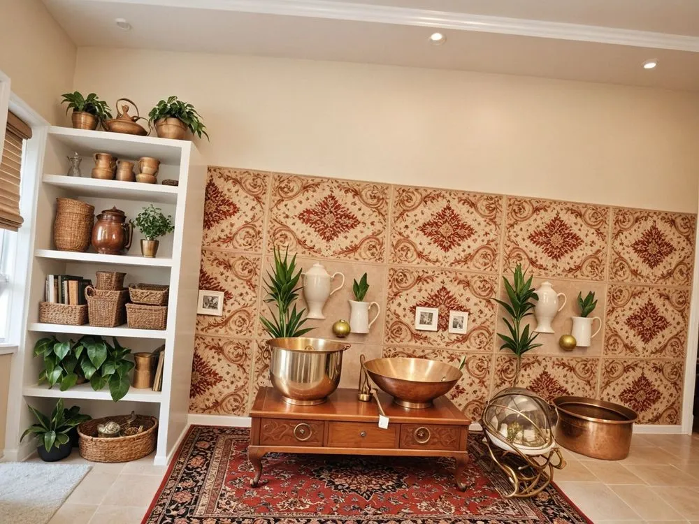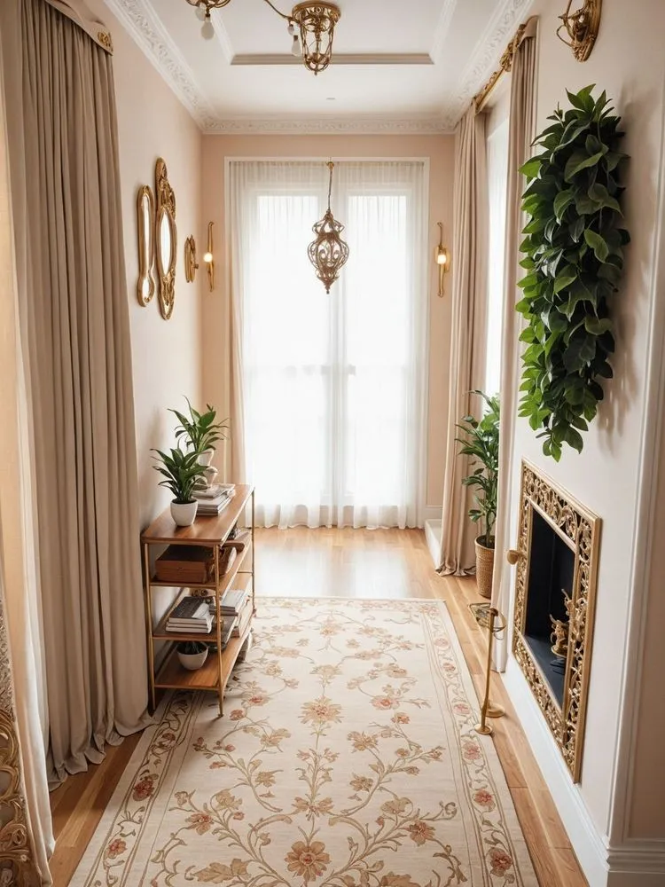 a room decorated in a traditional style with gold potted plants and vintage furniture