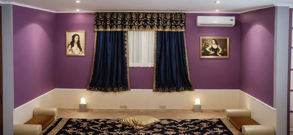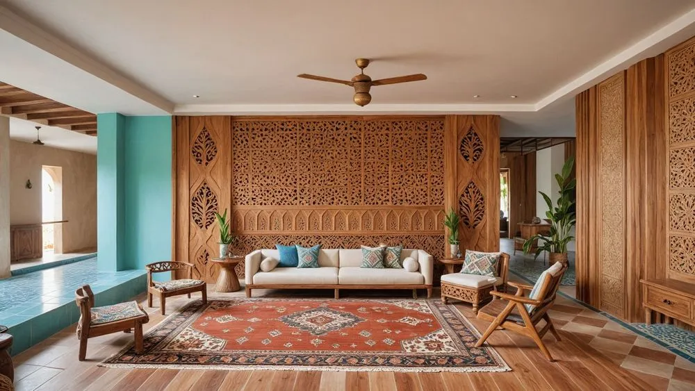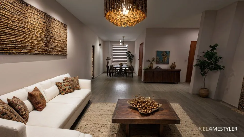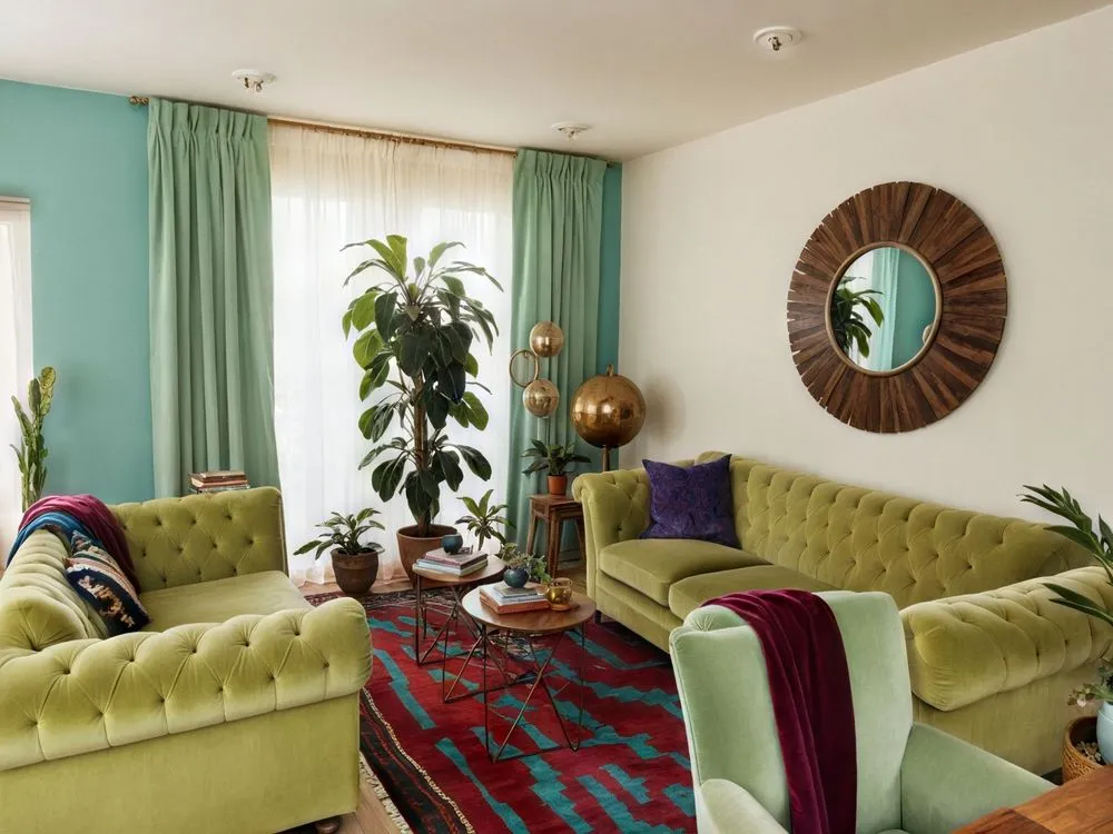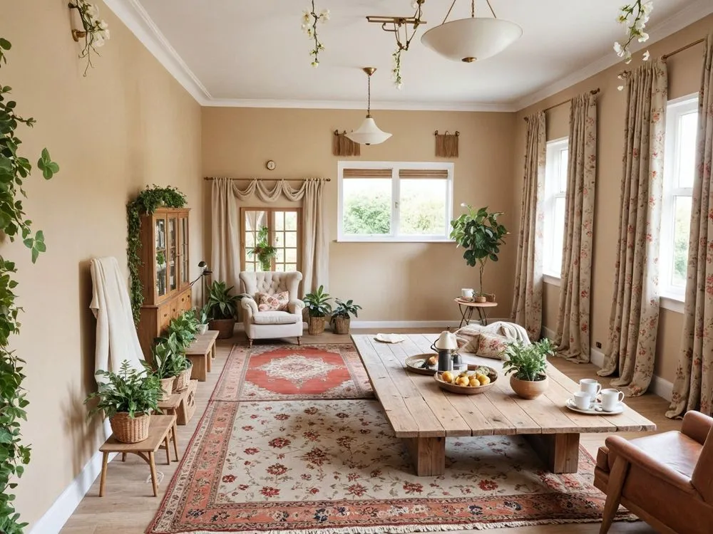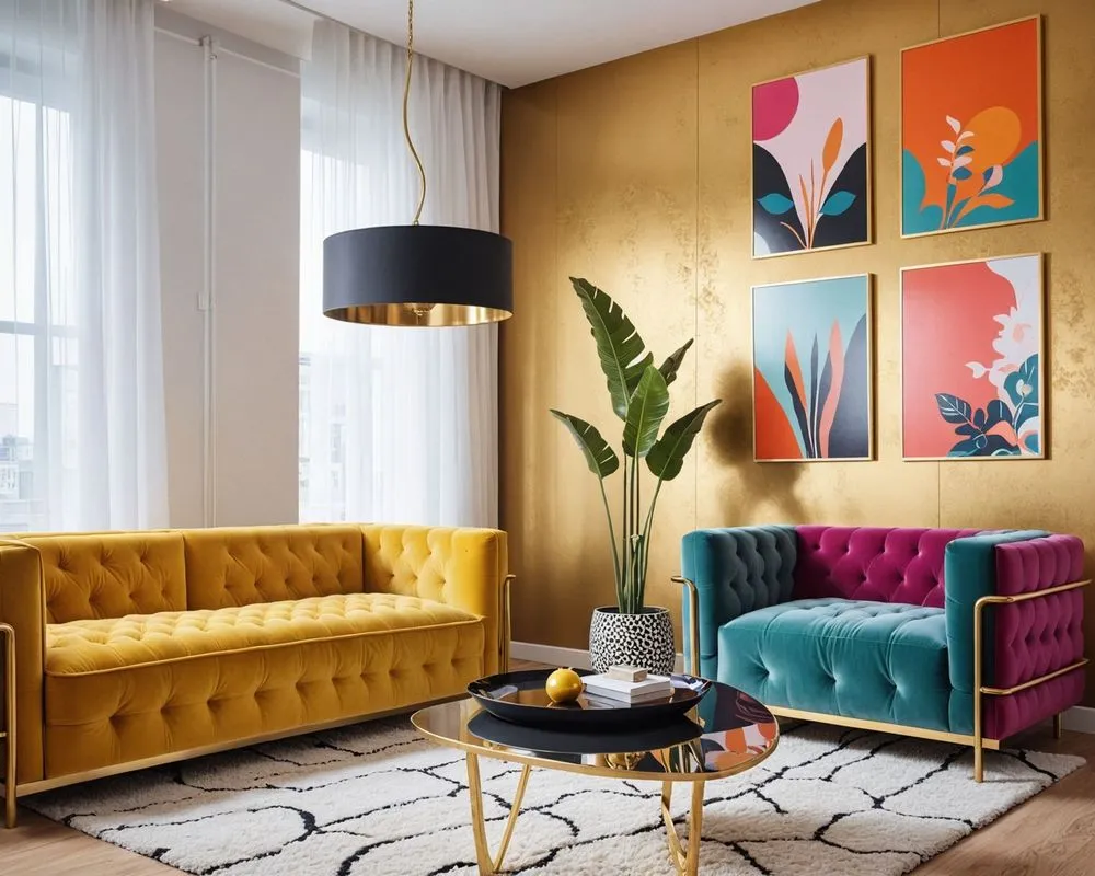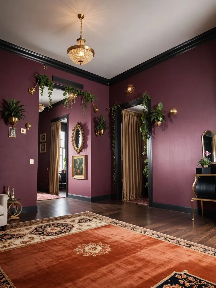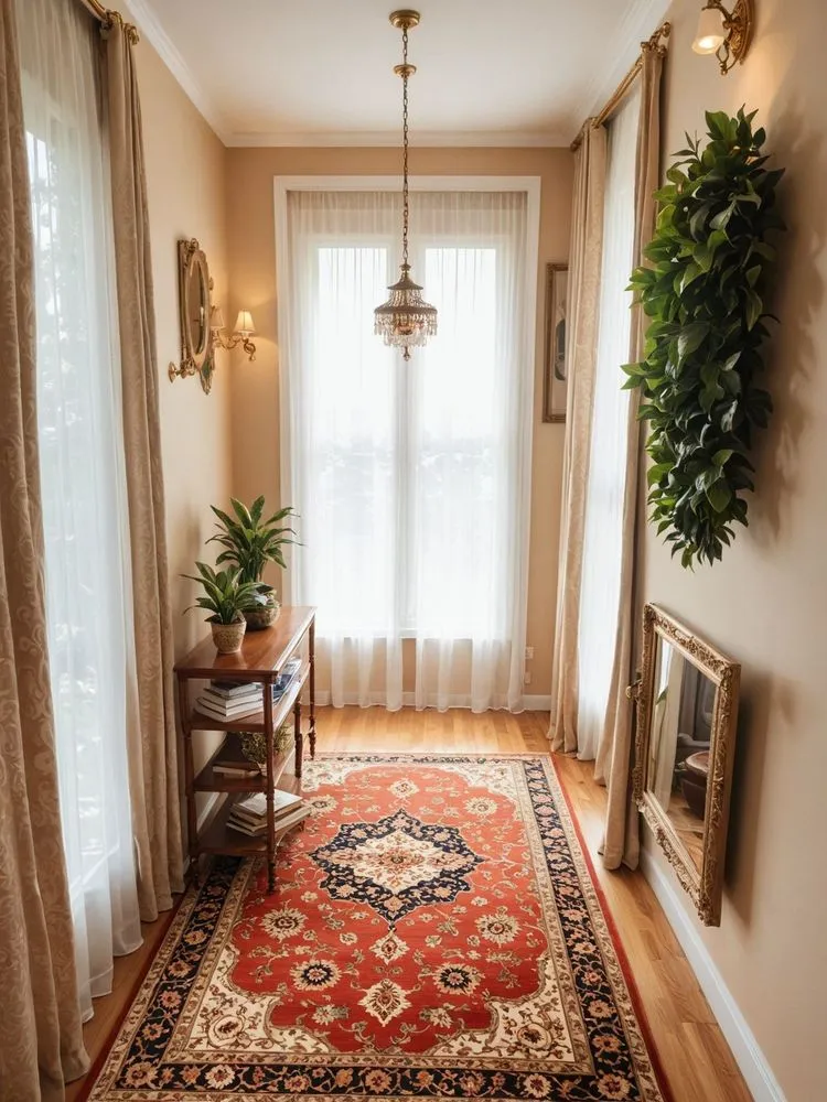 a room decorated in a traditional style with gold potted plants and vintage furniture