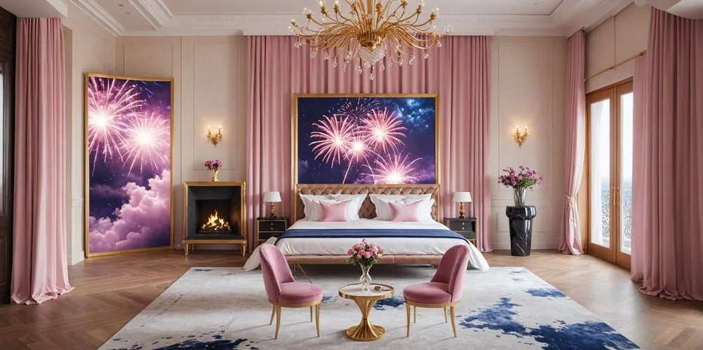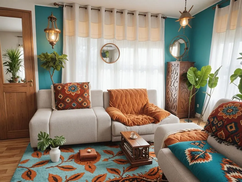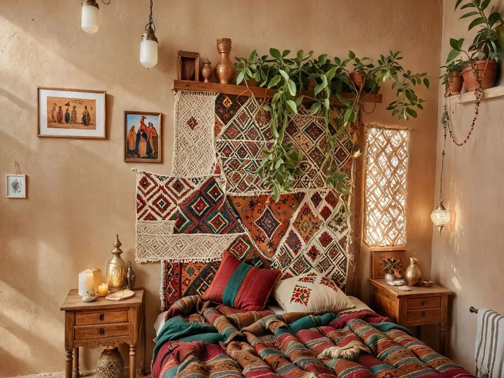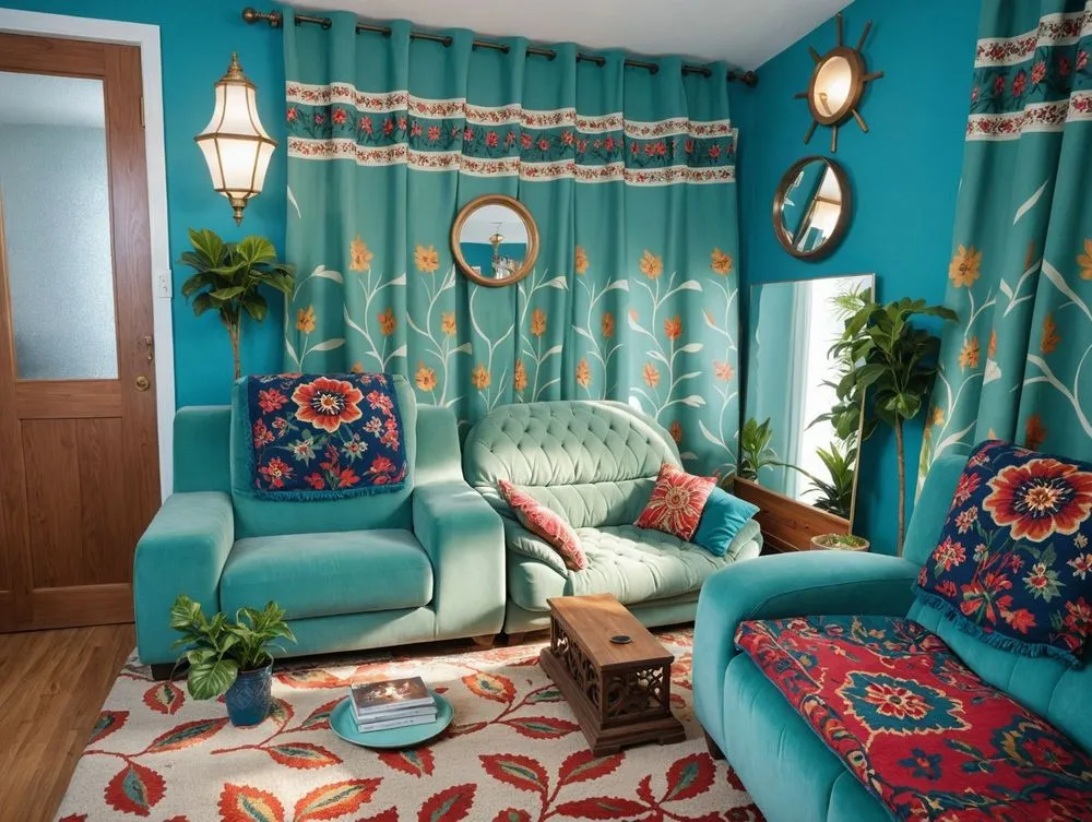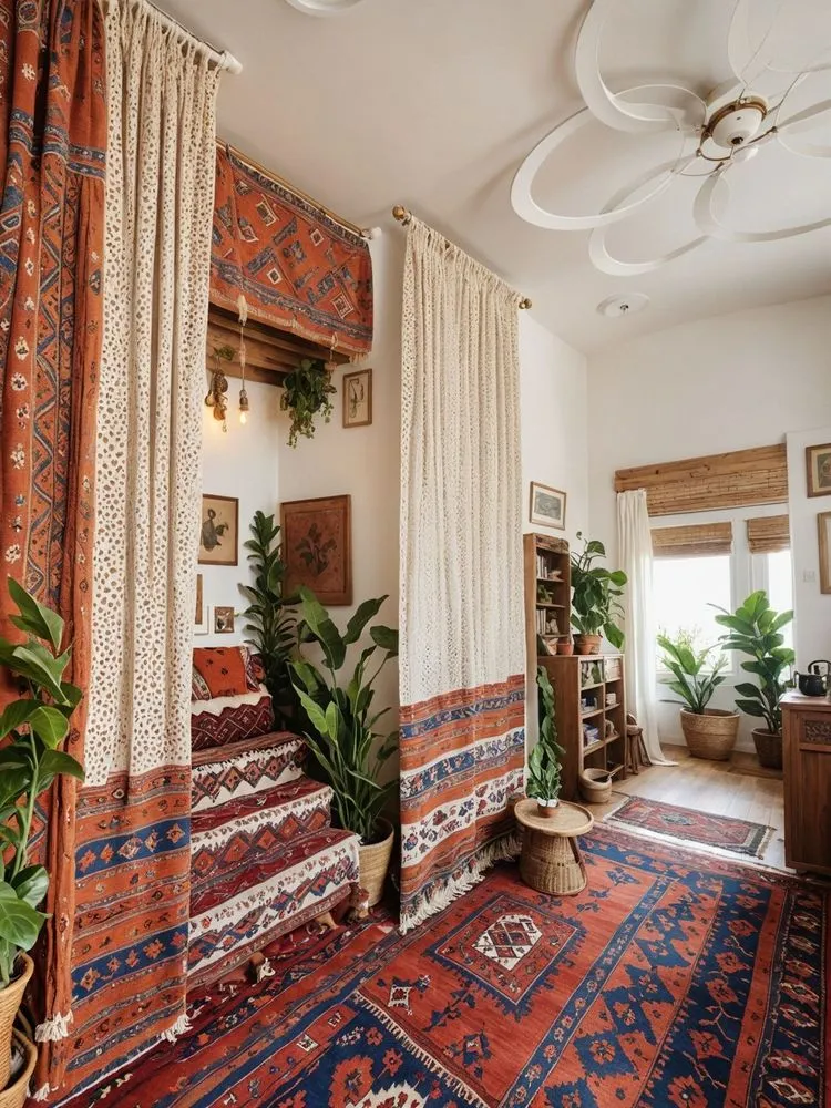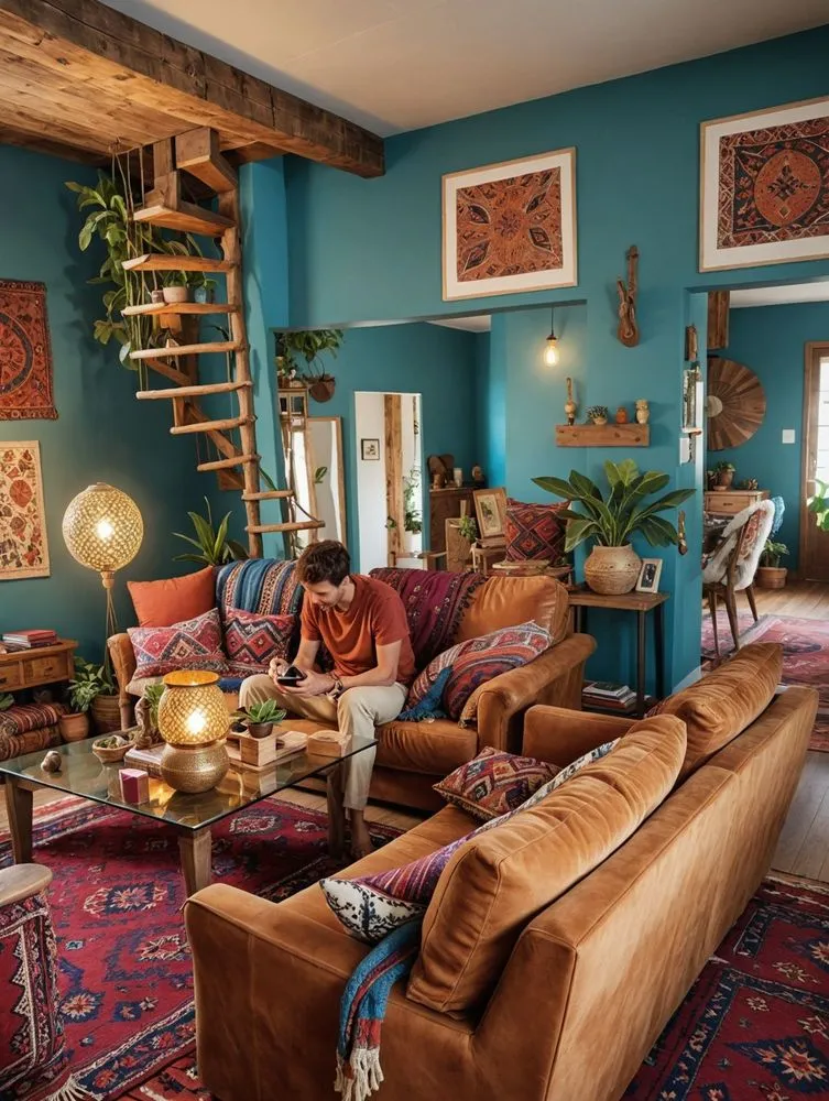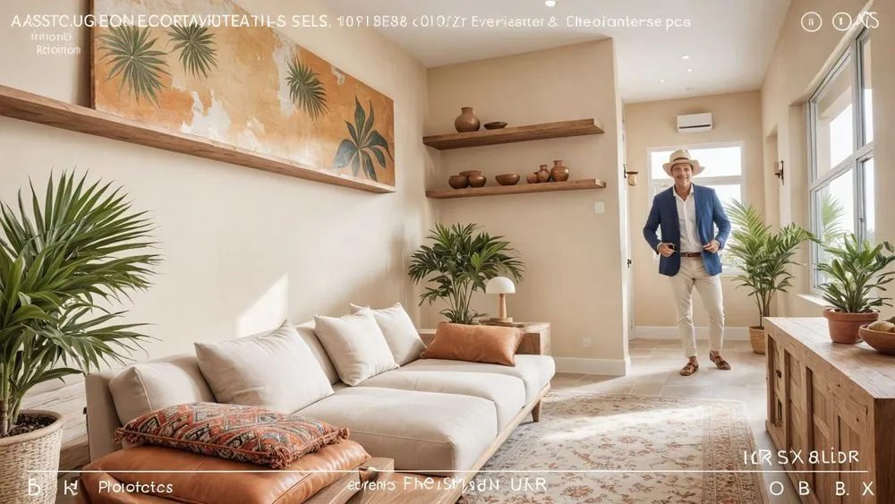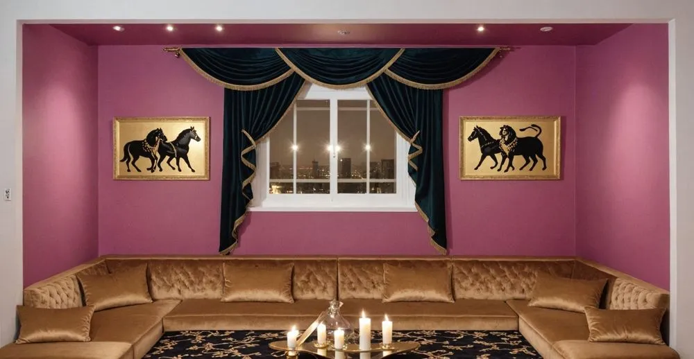 a room decorated in a traditional style with gold potted plants and vintage furniture