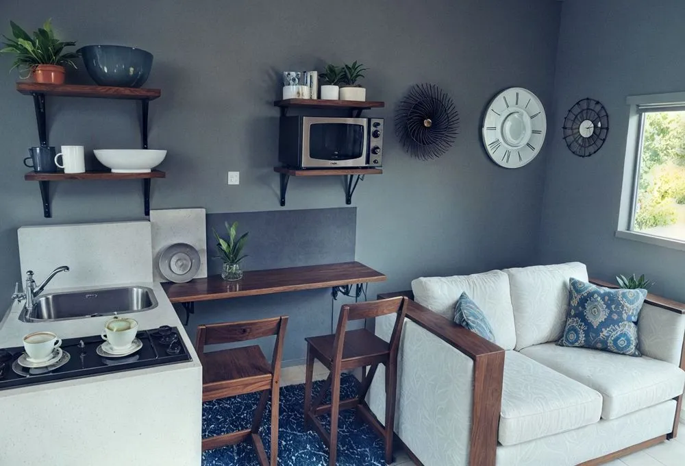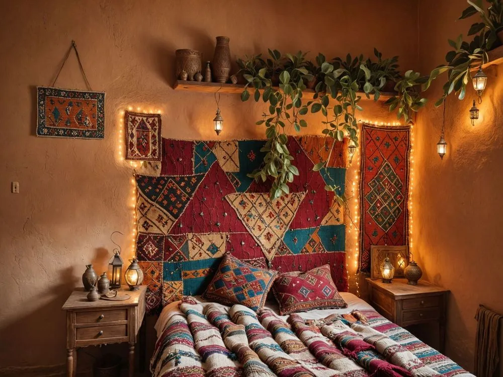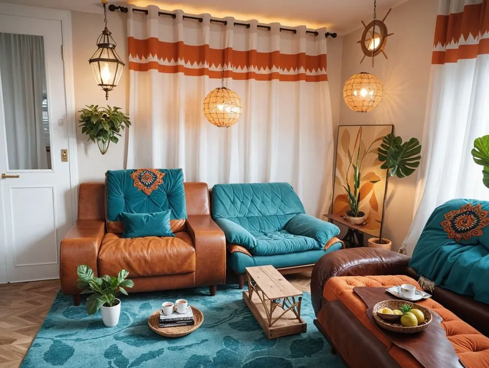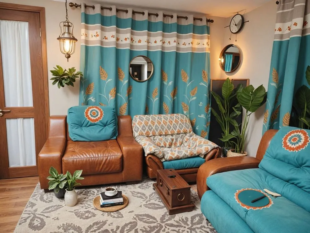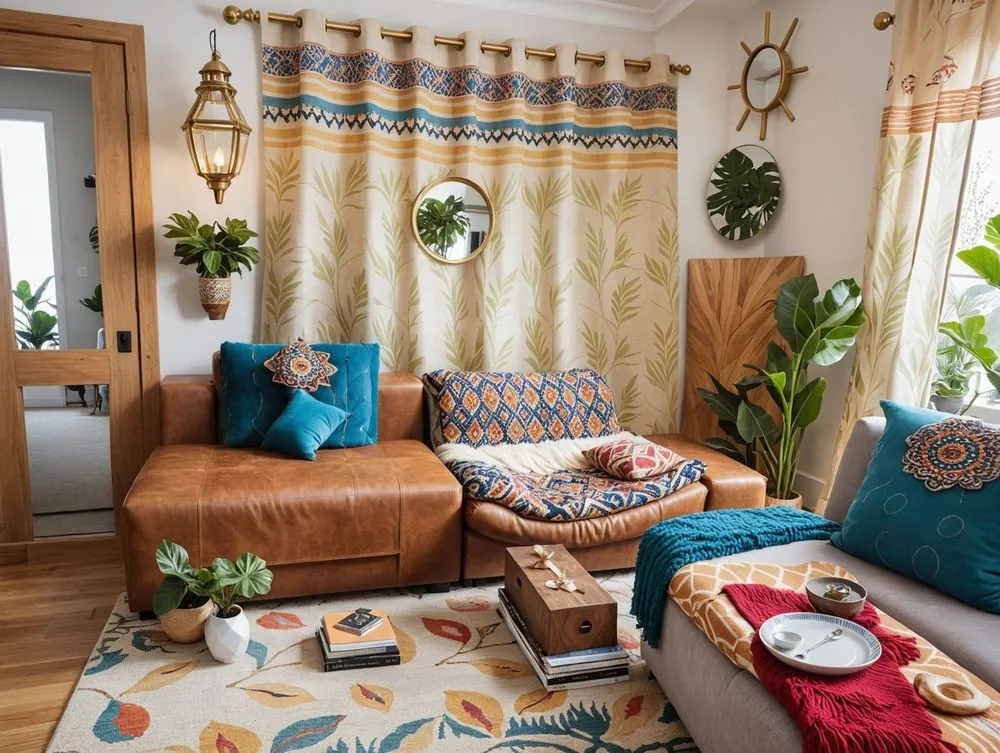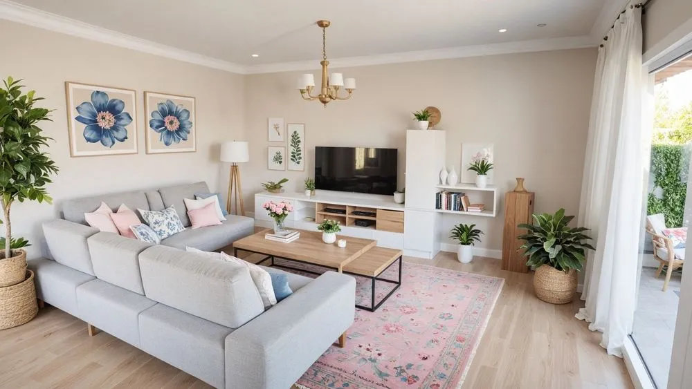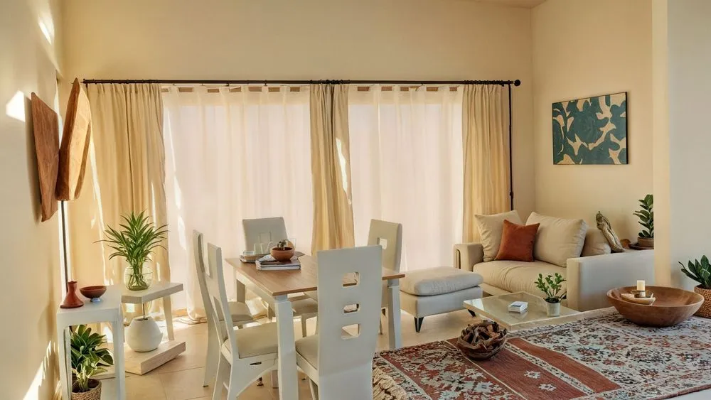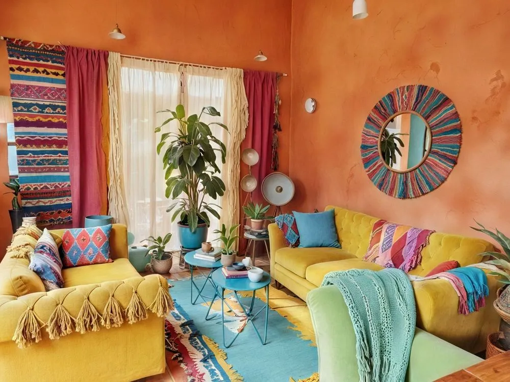 a room decorated in a traditional style with gold potted plants and vintage furniture