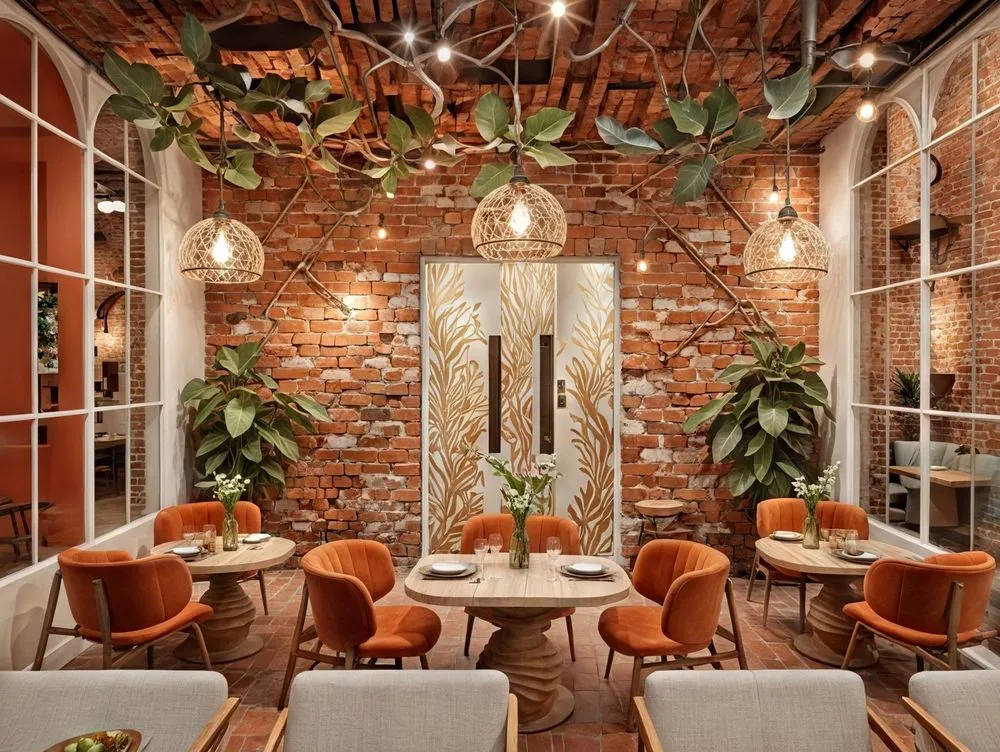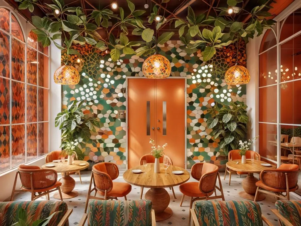 a very fancy and modern restaurant with tables, chairs, chairs, and plants