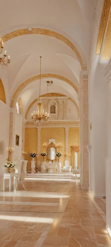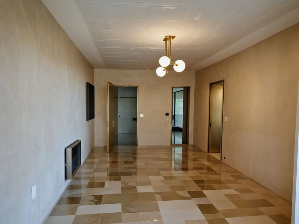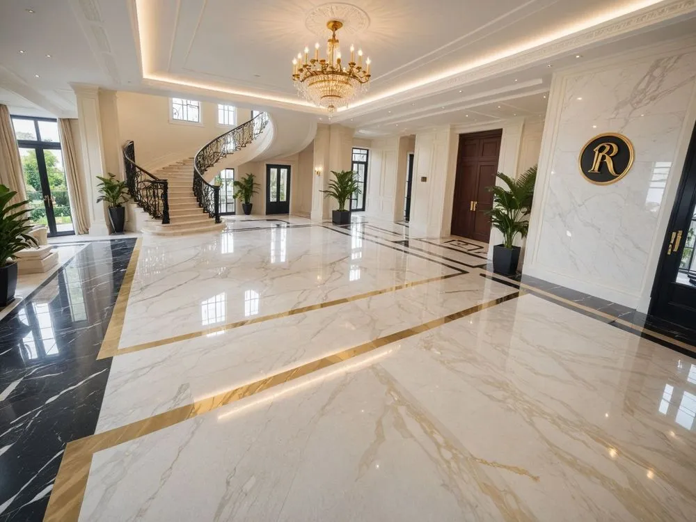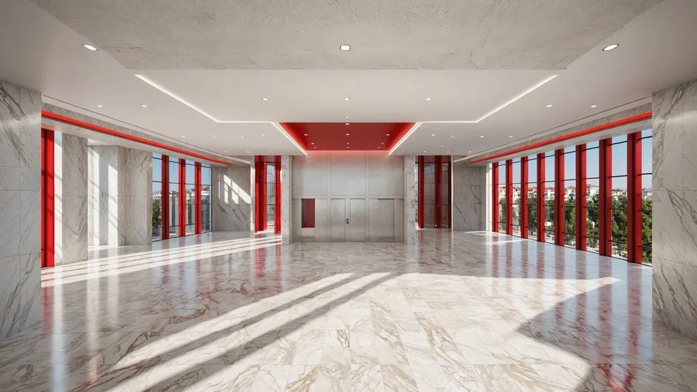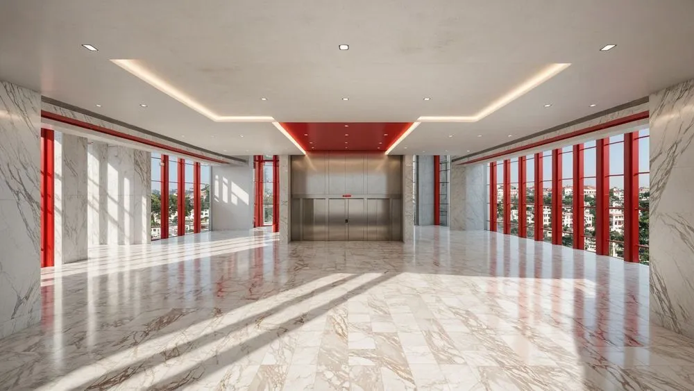 the floor is marble and has a red line that wraps in the direction of the elevator