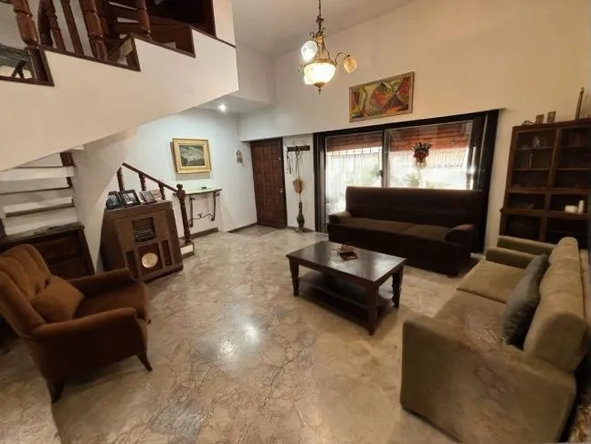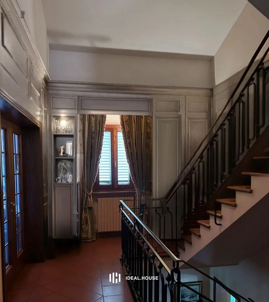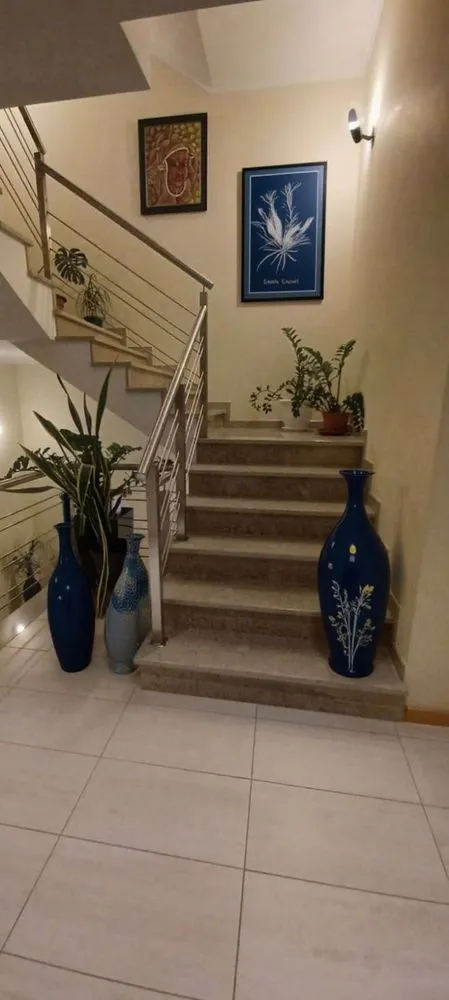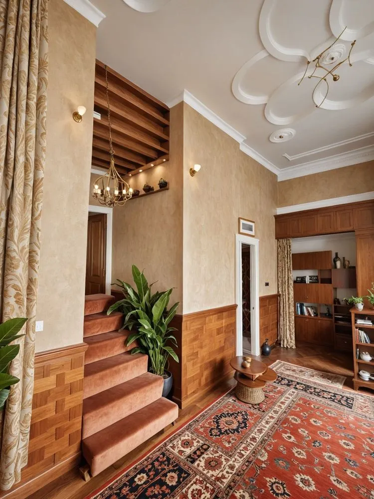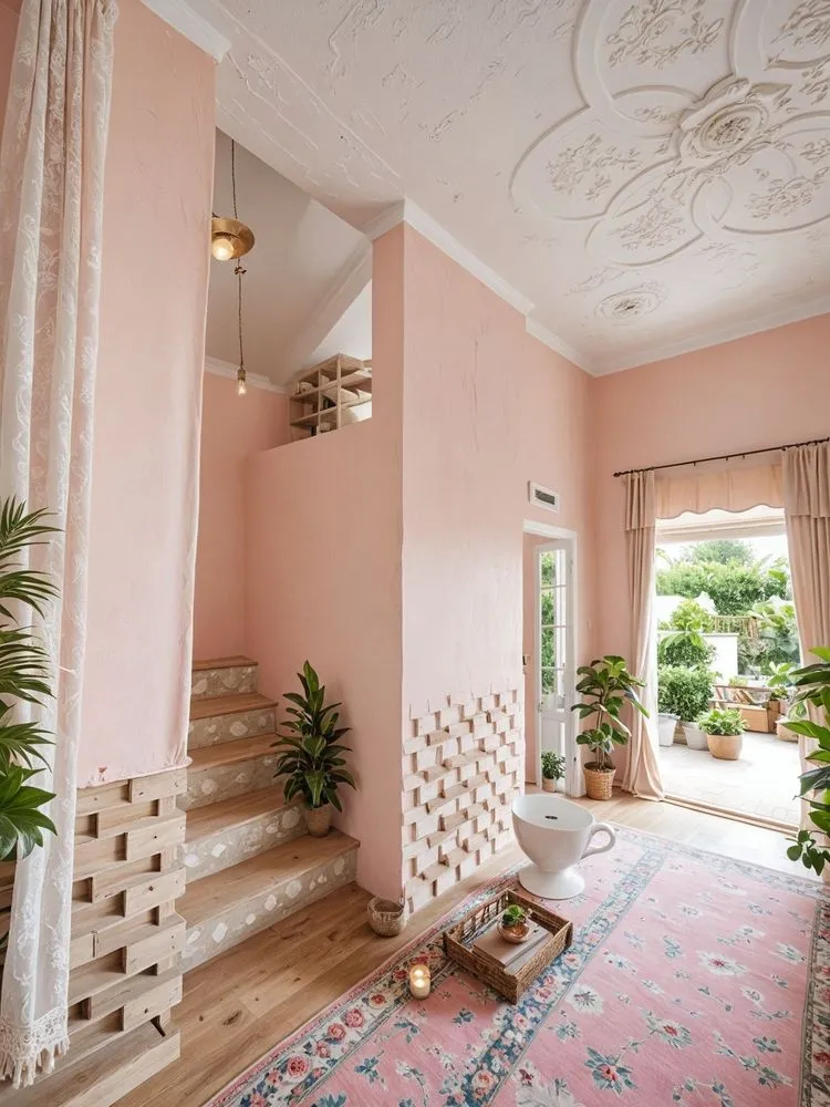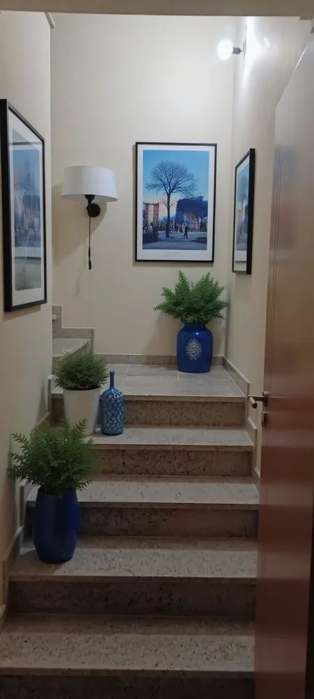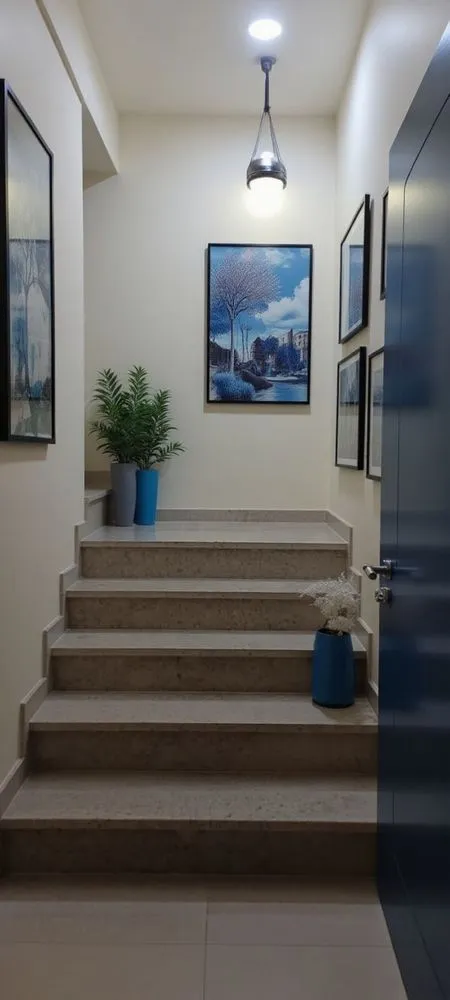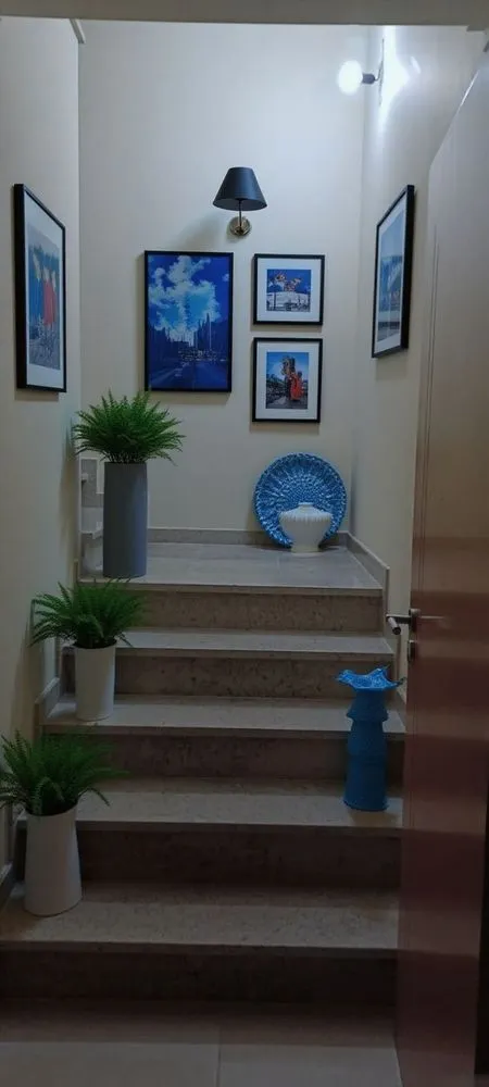 a stairwell leading to a living area with pictures on the walls and plants on the stairs