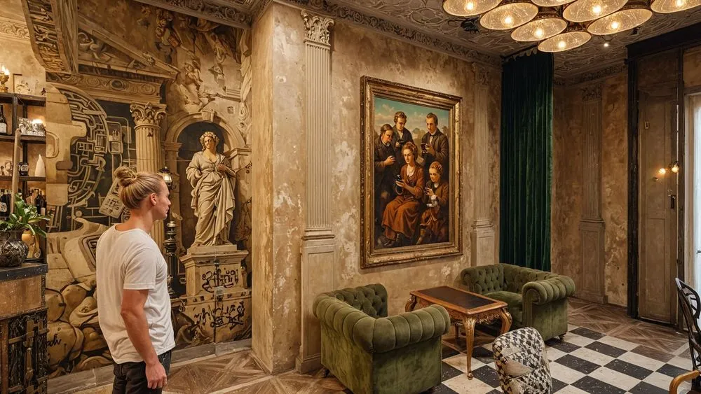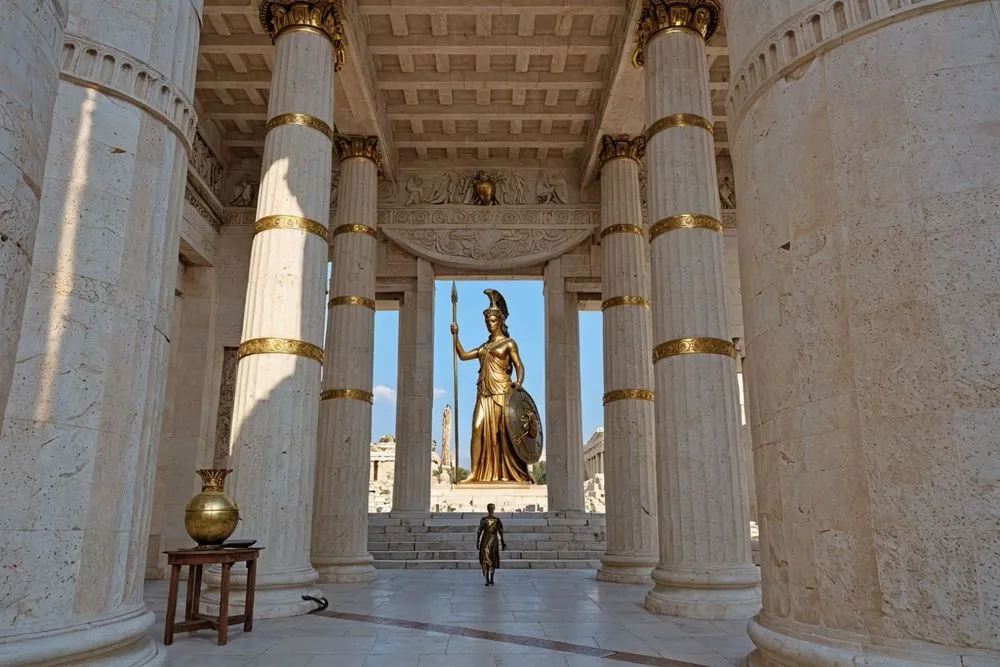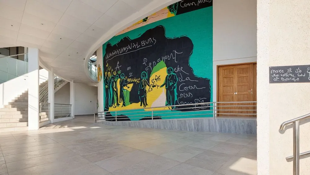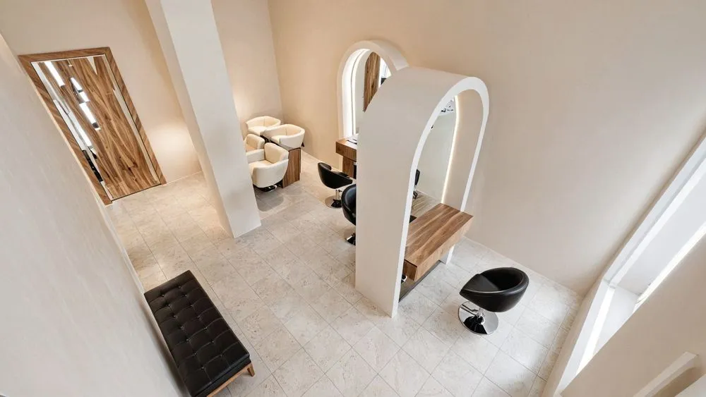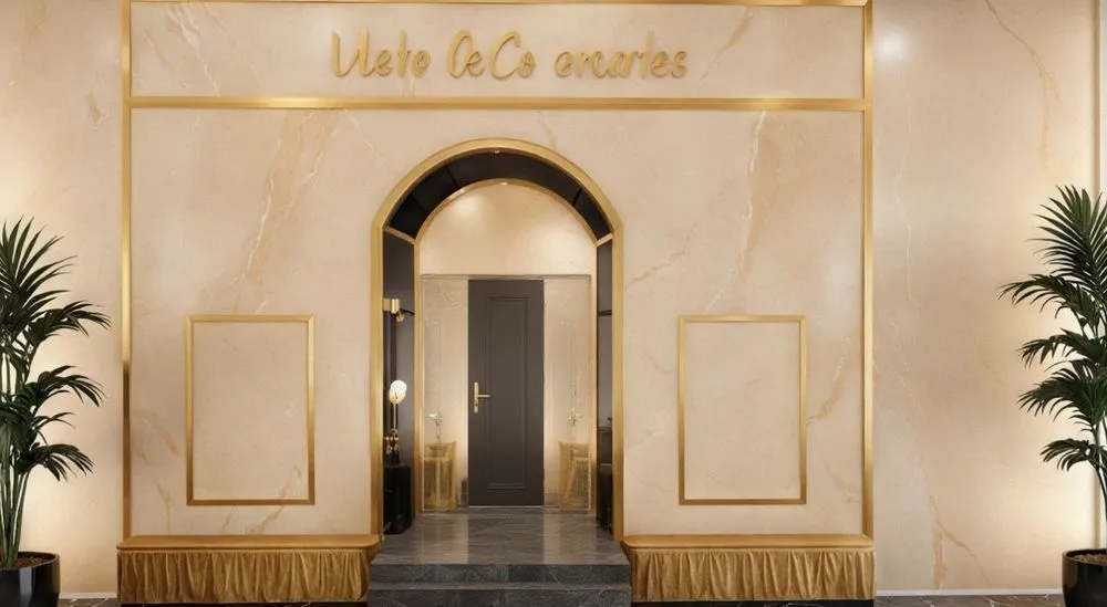 the lobby features two stone columns, a marble counter and a modern glass wall