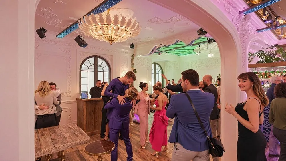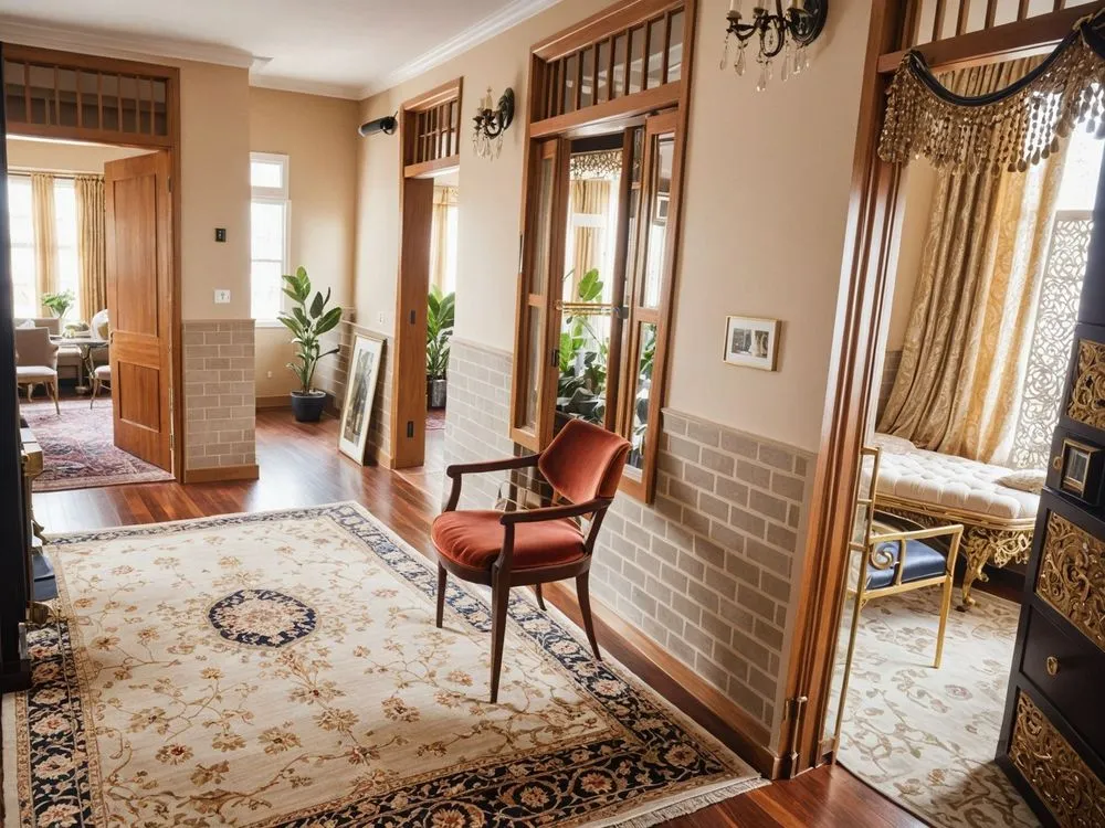 the foyer is very spacious and features an elegant rug, large windows, and art deco furniture